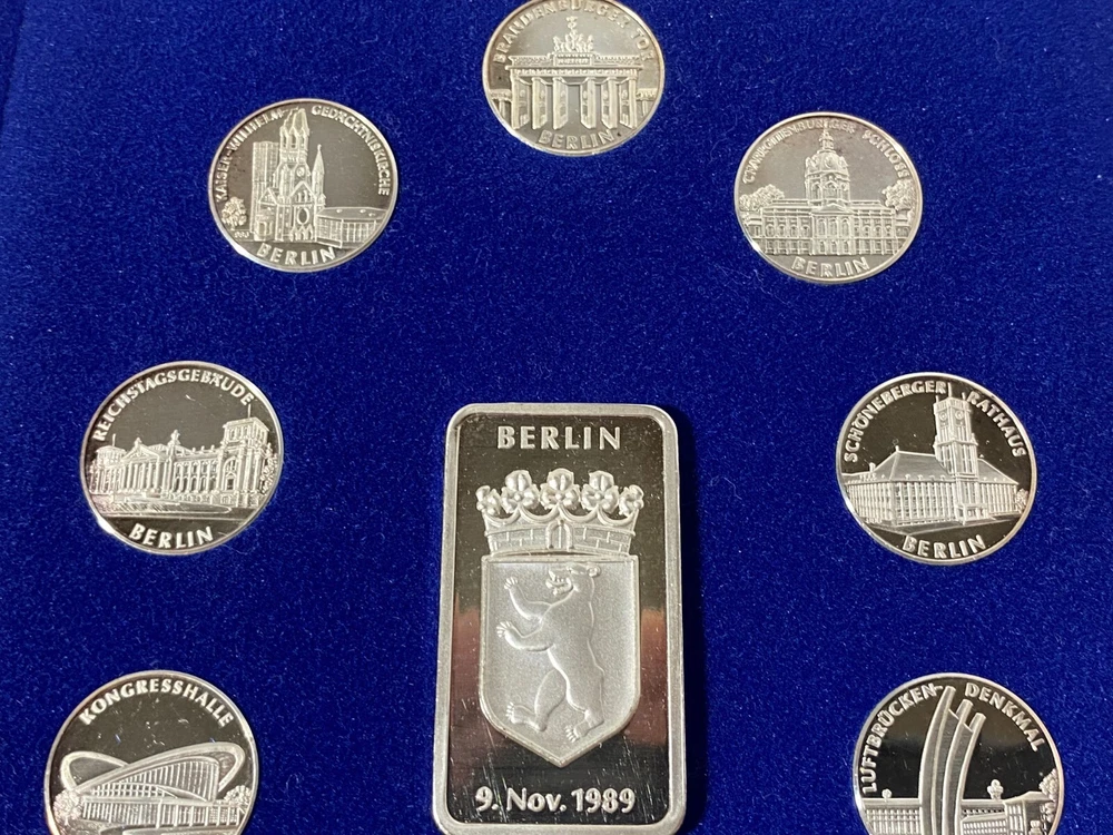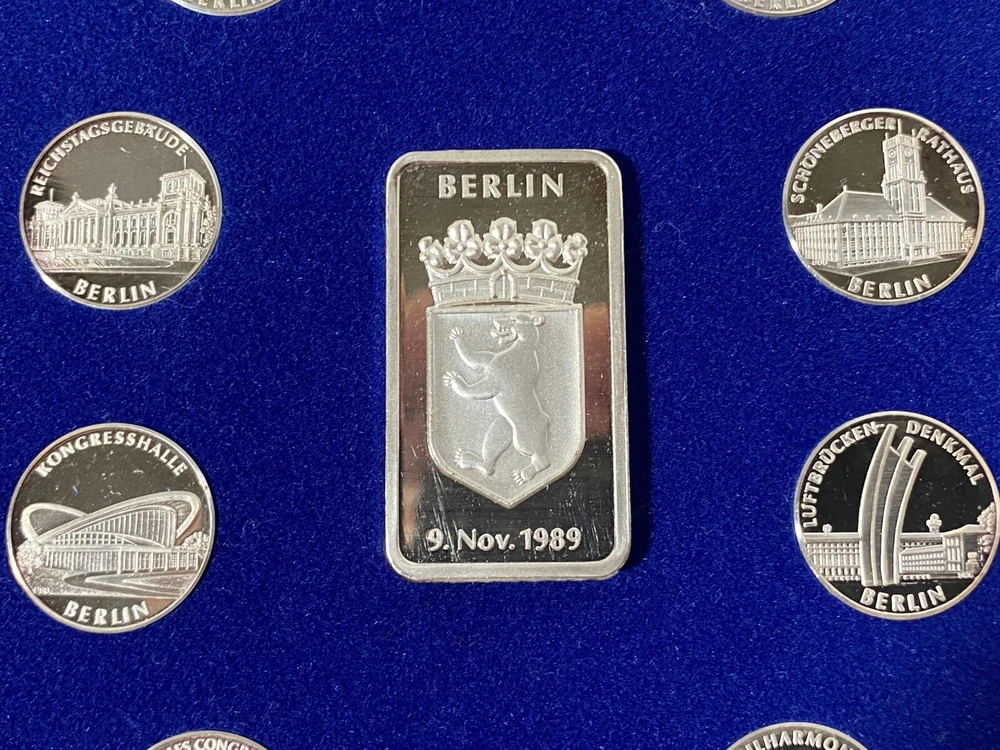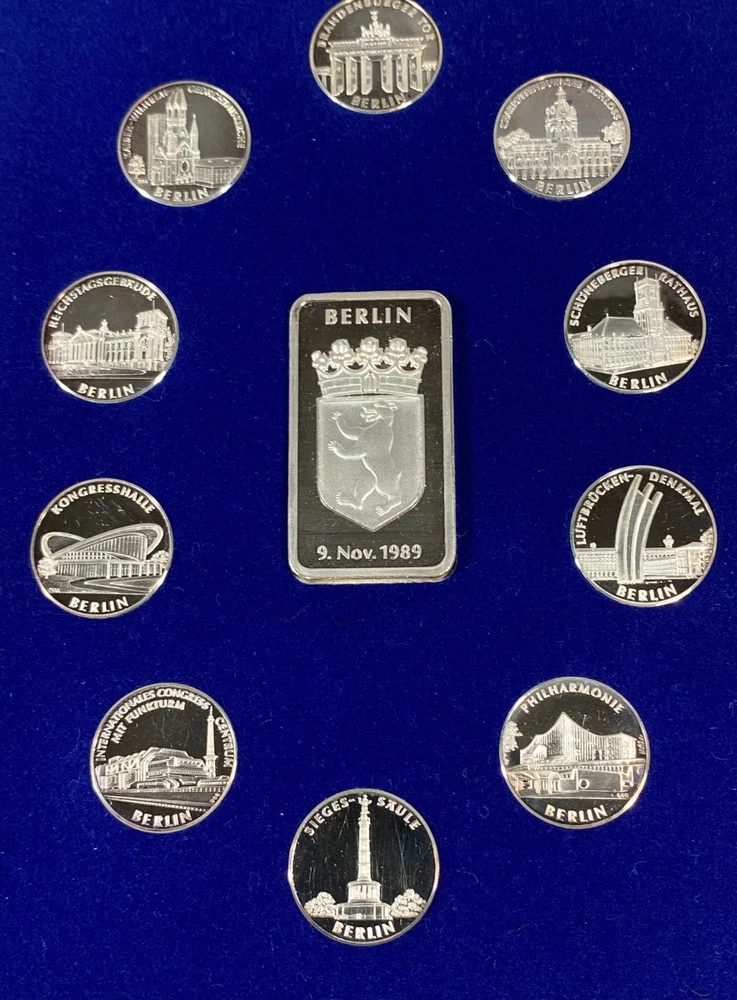 THIS IS A GREAT COMMEORATIVE COIN AND BAR SET OF THE FALL OF THE BERLIN WALL. .999 PURE SILVER DEPICTING LANDMARKS ( frame is 7.25" x 5.5" ) 10 COINS / 1 BAR EXCELLENT CONDITION OTHER THAN A FEW MINOR SCUFFS /SCRATCHES PLEASE EXAMINE PICTURES CAREFULLY FOR CONDITIONN AND SPECIFICS THANKS.,