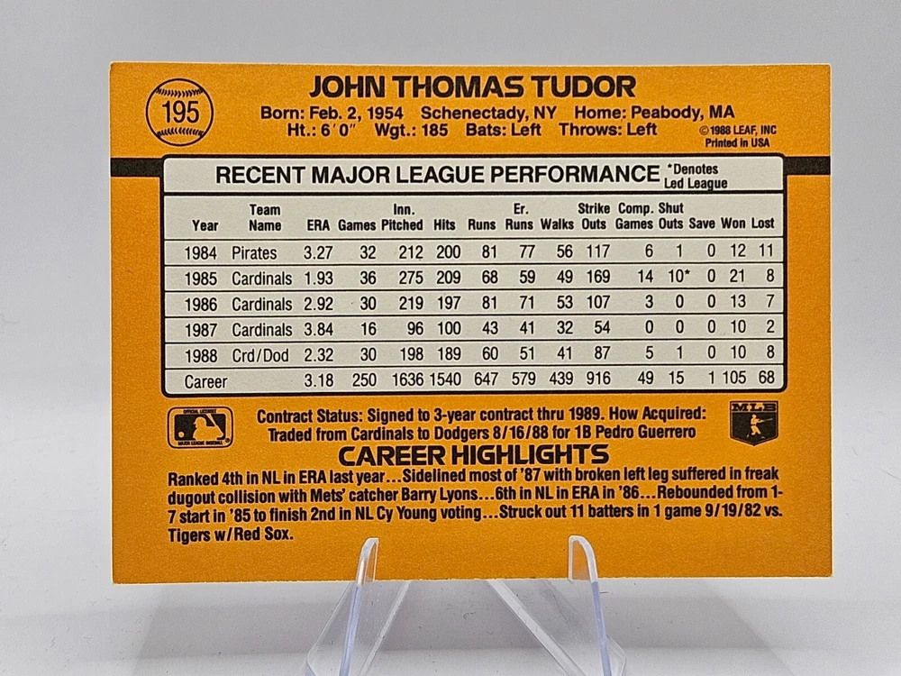 Step up to the plate with this 1989 Donruss #195 John Tudor baseball card, a must-have for any Los Angeles Dodgers or MLB memorabilia enthusiast. Featuring the seasoned pitcher John Tudor, this card captures the essence of the 1989 MLB season and is a tribute to Tudor's contribution to the sport. From the iconic 1989 Donruss set, this card is a piece of baseball history. It highlights the Los Angeles Dodgers team, allowing fans to relive the excitement of the era. Perfect for collectors or fans of the game, this card is a timeless addition to any sports trading card collection.