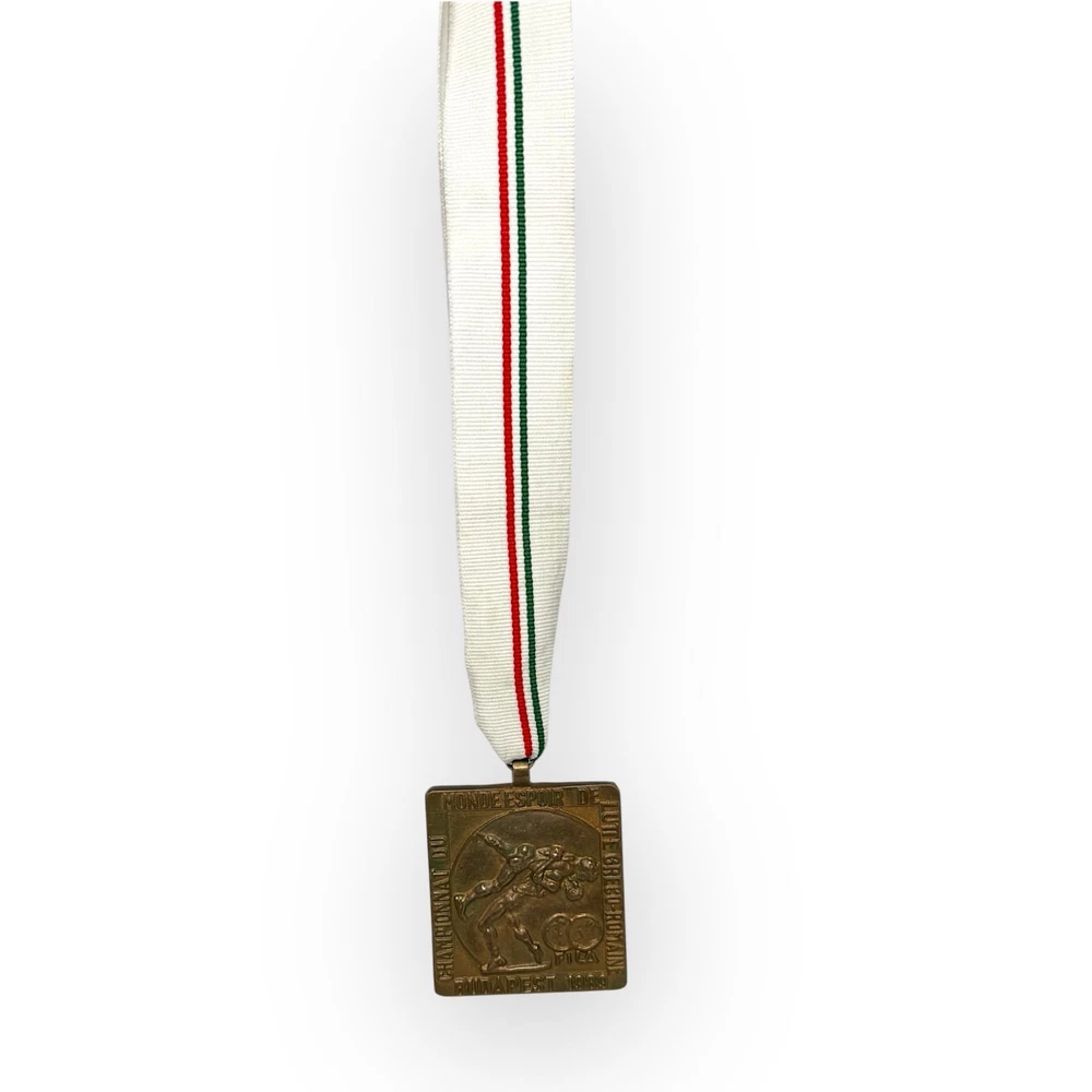 Gold Medal 🥇 at the FILA Junior World Championships in Greco-Roman wrestling. Event: Championnat du Monde Espoir de Lutte Gréco-Romaine (World Junior Greco-Roman Wrestling Championship) Fighter: Néstor Almanza Baró, won the world junior title in Budapest in Greco-Roman wrestling (lightweight category) Year: 1989 Location: Budapest, Hungary Organization: FILA (Fédération Internationale des Luttes Associées, now United World Wrestling) Shape: Rectangular with relief design Design (obverse) Central relief of two wrestlers in Greco-Roman combat French inscription: “CHAMPIONNAT DU MONDE ESPOIR DE LUTTE GRECO-ROMAINE – BUDAPEST 1989” FILA logo with Olympic rings Ribbon: White ribbon with red and green stripes (colors of Hungary) Condition: Vintage collectible medal, preserved with natural patina and minor signs of age Medalla de Oro 🥇 del Campeonato Mundial Juvenil (Junior World Championship) de la FILA en lucha grecorromana. Evento: Championnat du Monde Espoir de Lutte Gréco-Romaine (Campeonato Mundial Juvenil de Lucha Grecorromana) Luchador: Néstor Almanza Baró, ganó el título mundial juvenil de lucha grecorromana en Budapest (Hungría), en la categoría ligera (74 kg). Año: 1989 Lugar: Budapest, Hungría Organización: FILA (Fédération Internationale des Luttes Associées, hoy United World Wrestling) Forma: Rectangular con relieve Diseño (anverso) Relieve central de dos luchadores en combate grecorromano Inscripción en francés: “CHAMPIONNAT DU MONDE ESPOIR DE LUTTE GRECO-ROMAINE – BUDAPEST 1989” Logotipo de FILA con los anillos olímpicos Cinta: Cinta blanca con franjas rojas y verdes (colores de Hungría) Condición: Medalla vintage de colección, con pátina natural y leves marcas de antigüedad