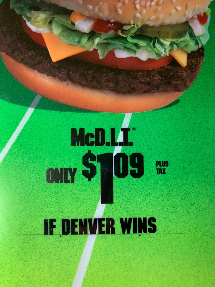 1989 McDonald's Who Will Win Super Bowl XXIV Translite Store Display Sign 21 3/4” x 21 3/4” Has scratches and dents(refer to pictures) Has a large dent on one side(pictured) Will be shipped rolled up in a poster tube Please feel free to ask any questions m.