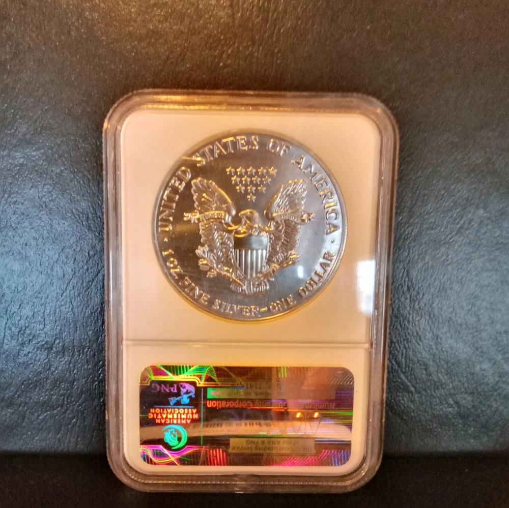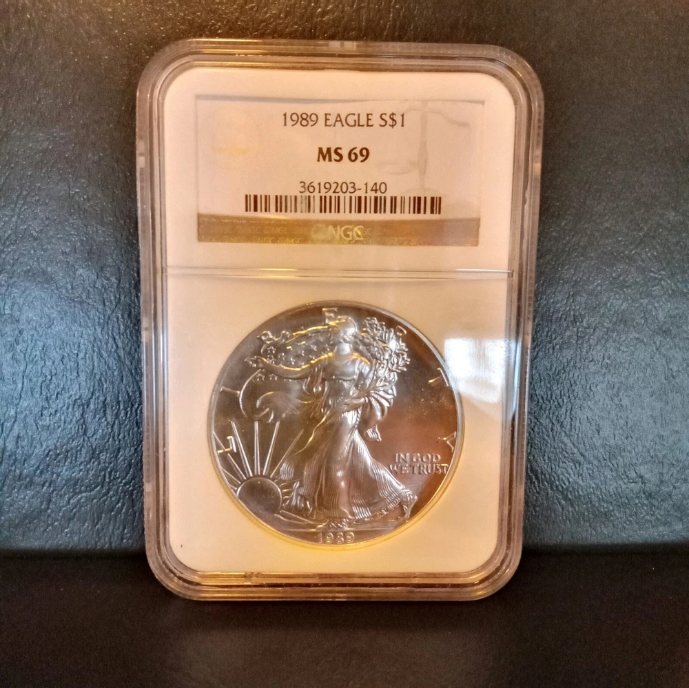 Year:1989Certification:NGCCoin:American EaglePrecious Metal Content per Unit:1 ozGrade:MS 69Fineness:0.999Composition:SilverBrand/Mint:U.S. MintStrike Type:BusinessCertification Number:3619203-140Country/Region of Manufacture:United States