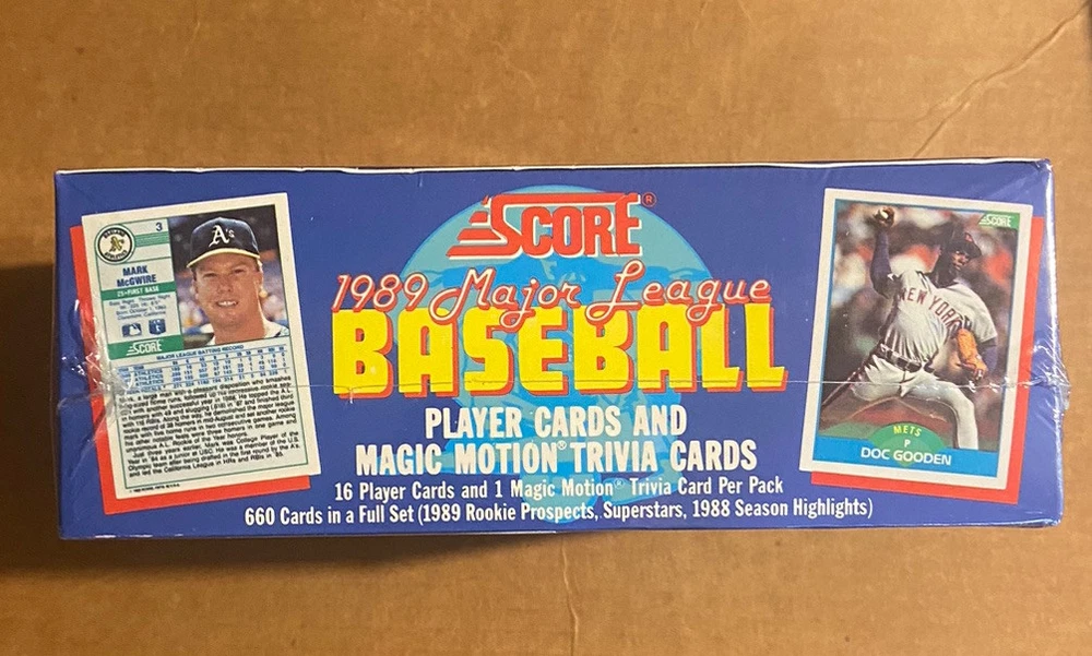 The product is a 1989 Score unopened wax box of baseball cards. It contains 36 packs of standard-sized sports trading cards from the Major League (MLB) season of 1989. The cards are part of the base set and were manufactured by SCORE. The box is a box configuration and was manufactured in 1989. This 660-card standard-size set was distributed by Major League Marketing. Cards feature six distinctive inner border (inside a white outer border) colors on the front. Subsets include Highlights (652-660) and Rookie Prospects (621-651). Rookie Cards in this set include Brady Anderson, Craig Biggio, Randy Johnson, Gary Sheffield, and John Smoltz 36 packs per box 16 cards per pack Look For Randy Johnson Rookies Look For John Smoltz Rookies Look For Gary Sheffield Rookies
