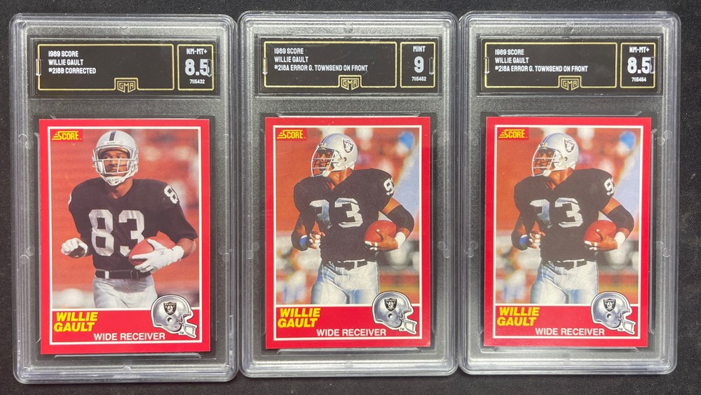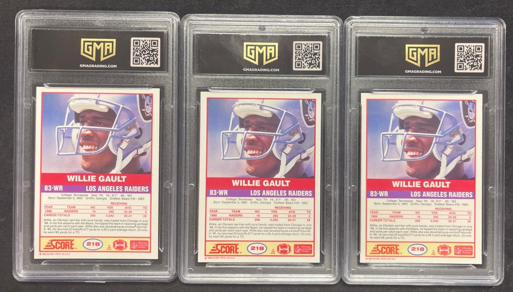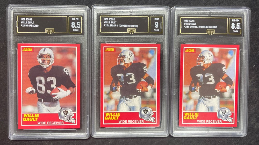 1989 Score Football #218A #218B Willie Gault 3 card Lot Graded GMA 9, 8.5, 8.5 Mint Error & Corrected Ships USPS