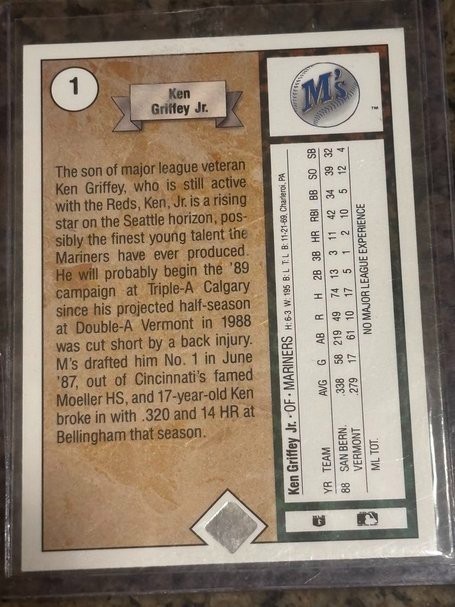 The product is a 1989 Upper Deck Rookie Ken Griffey Jr #1 trading card featuring the baseball player from the Seattle Mariners. This classic card is a piece of sports memorabilia from the Major League Baseball (MLB) season of 1989, manufactured by Upper Deck. With its iconic imagery and historical significance, this card is a must-have for any baseball card collector looking to add a piece of baseball history to their collection.