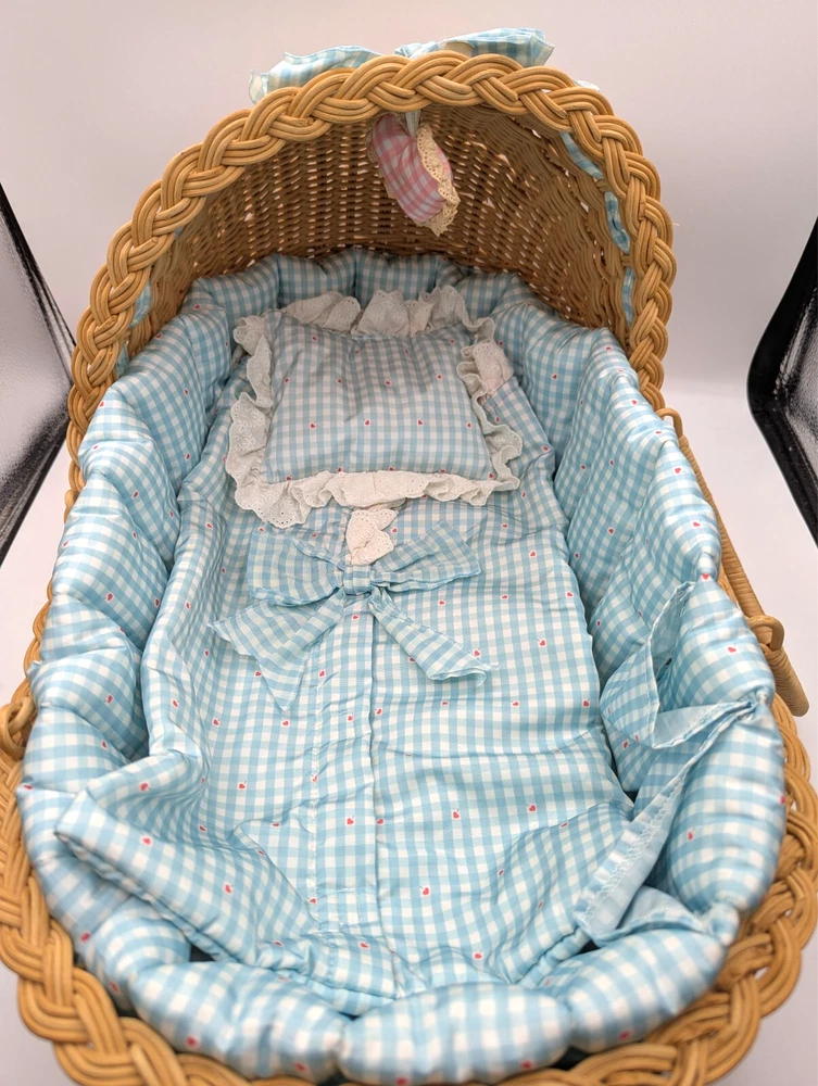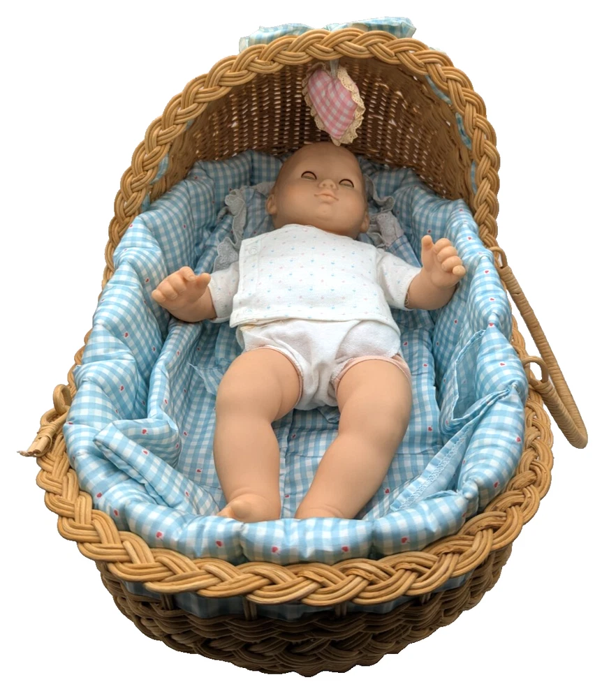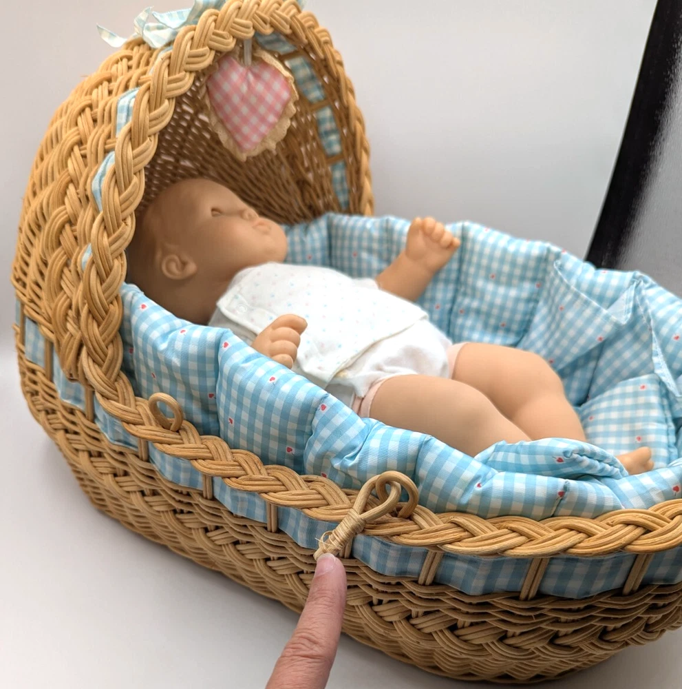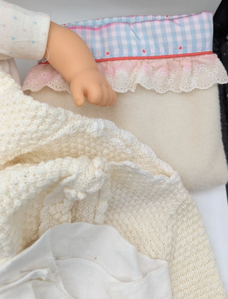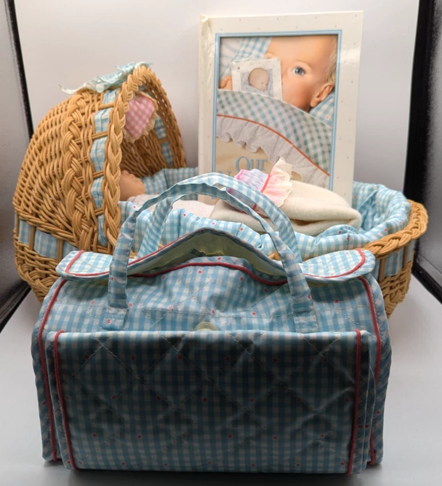 American Girl Bitty Baby Pleasant Company Our New Baby 1990 Vintage Book Basket, In Good Condition! HUGE LOT!!! There is some wear due to the age and play, The corner of book has rip but the book still full function with all the interaction pull tabs in it, There is fabric bleeding on some of the blankets and clothes all as seen in the photos, SEE ALL PHOTOS! There is a lot that comes with the doll and wicker bassinet! See all the photos to see all that comes with this lot of American Girl Doll and Basket Bed. Any questions please ask, Thank You!