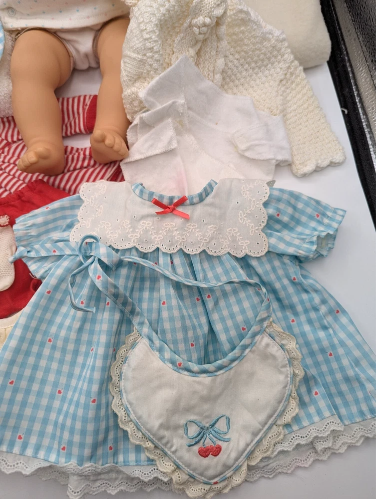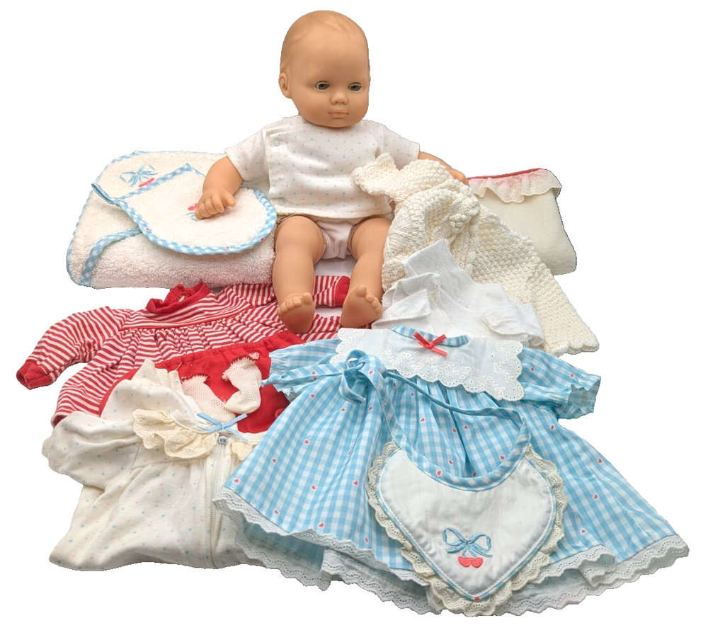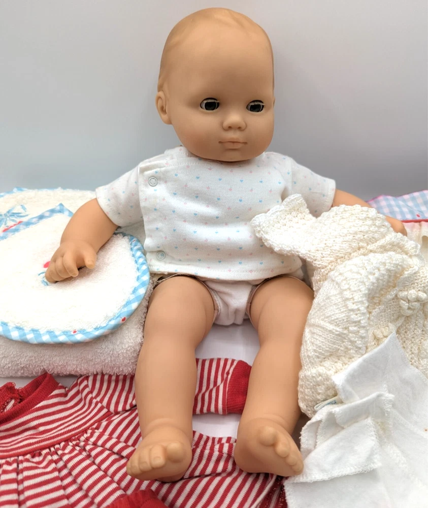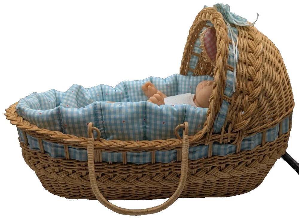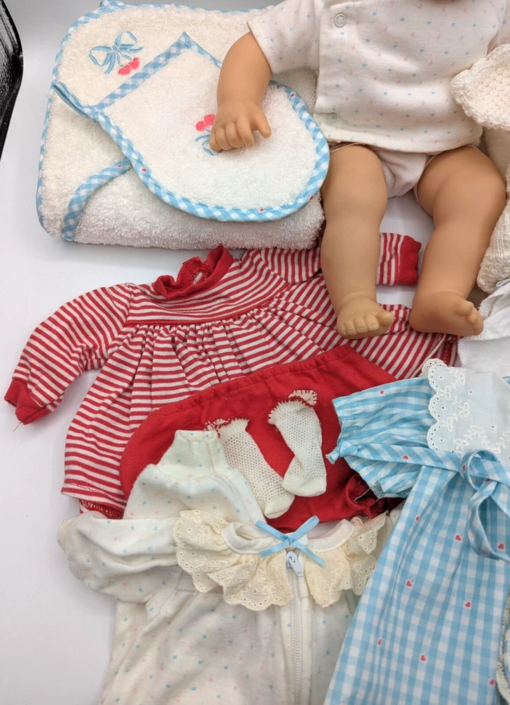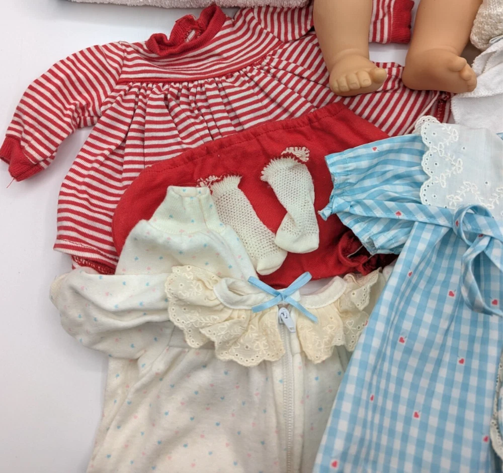 American Girl Bitty Baby Pleasant Company Our New Baby 1990 Vintage Book Basket, In Good Condition! HUGE LOT!!! There is some wear due to the age and play, The corner of book has rip but the book still full function with all the interaction pull tabs in it, There is fabric bleeding on some of the blankets and clothes all as seen in the photos, SEE ALL PHOTOS! There is a lot that comes with the doll and wicker bassinet! See all the photos to see all that comes with this lot of American Girl Doll and Basket Bed. Any questions please ask, Thank You!