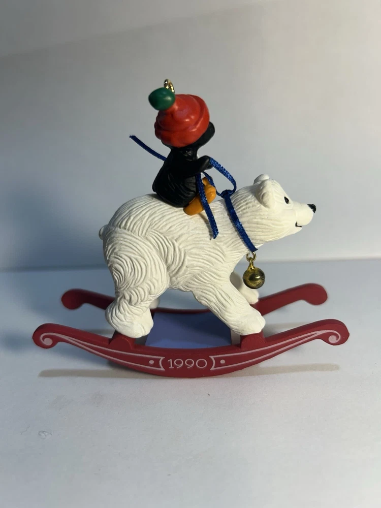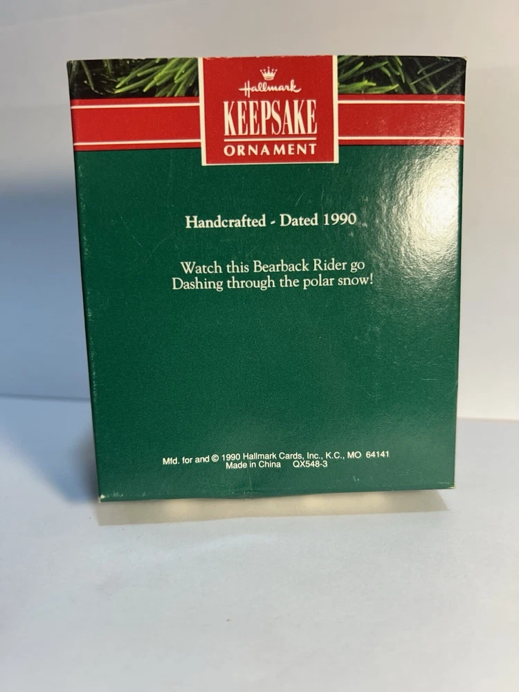 The 1990 Bearback Rider Hallmark Keepsake Ornament features a polar bear and penguin in a Bear & Penguin design. This collectible ornament is part of the Hallmark collection and was manufactured in China. It is from the holiday-themed Ornaments series.