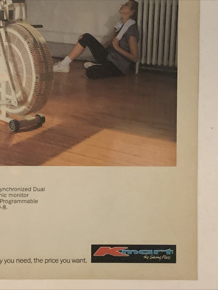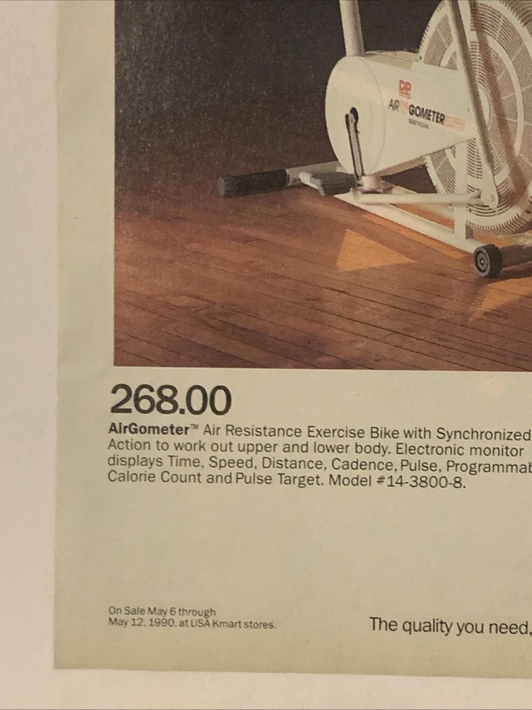 The 1990 Kmart PRINT AD features the DP AirGometer Exercise Bike. This original ad from the United States measures approximately 8"x11". Perfect for collectors of advertising memorabilia and fans of retro department store promotions, this vintage ad showcases the company's products and promotions from the 1990s.
