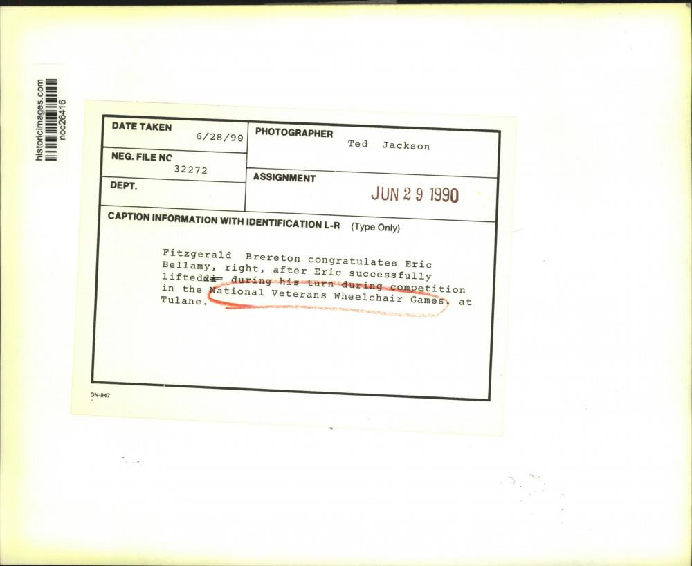 ebay template Note: Please study the images carefully to determine the condition of this vintage photograph, as it may not be in perfect condition. It may contain wrinkles, cracks, and possibly even tears due to its age and how it was handled before it got to us. A scanner may interpret colors and contrast differently than human eyes will, so it is possible that the actual photograph may be slightly darker or lighter in person. This vintage photograph is offered for sale as a collectible item and conveys no transfer of copyright. 1990 Press Photo National Veterans Wheelchair games participants - noc26416 This is an original press photo. Fitzgerald Brereton congratulates Eric Bellamy, right, after Eric successfully lifted during his turn during competition in the National Veterans Wheelchair Games at Tulane. Photo measures 10 x 8.25 inches. Photo is dated 06-28-1990. PHOTO FRONT PHOTO BACK Historic Images Part Number: noc26416 FAQs Q: Can I just download a digital version instead? A: No, we sell only vintage originals and do not make or distribute any copies, including digital ones. Q: Do you combine shipping and invoices? A: Multiple photos won on the same seller ID combine automatically through the eBay checkout process. If you encounter problems with this, send us a message via eBay messaging and we will send you an invoice. Due to eBay limitations, we cannot combine items won on our different seller IDs for a single shipping charge. Q: How quickly do you ship the items once paid? A: We ship within one business day after your payment clears. If you do not receive an "order shipped" email from us by the close of the second business day from submitting payment, please e-mail us via eBay messaging. Q: How do you make sure my photograph arrives safely? A: We package each order between two cross-corrugated pieces of cardboard to ensure that the package is as difficult to bend as possible. We then wrap each order in a plastic sheet to help protect against moisture. We want you to rest assured that we take every precaution to ensure that the photograph you receive will be in the same condition in your care as it was in ours. Q: Will the "Historic Images" watermark be on my photo when I receive it? A: No. This is a digital watermark we use to protect our images. It is not printed on the photo. Q: What are your office hours? A: eBay for us is a business, and a very fun one to be in! We are open M-F 9 to 5 (CST). Therefore, we do not return e-mails and phone calls over the weekend. We observe the following holidays: New Years Day, Memorial Day, Fourth of July, Labor Day, Thanksgiving and the day after Thanksgiving, Christmas Eve and Christmas Day. Q: Where did all these vintage photos come from? A: These original vintage photographs are from various news service and newspaper photo archives from locations around the country including: Boston, Detroit, Tampa, Chicago, Denver, Seattle, New Orleans, Milwaukee, Portland, Spokane, and more. We do not copy or reproduce any photographs -- every item is a unique vintage piece that was housed in a news archive. Q: Can I use this photograph in my book/blog/website? A: The short answer is no. There is no transfer of copyright for republication or reproduction with these photographs when you purchase them, and only photographs taken before 1923 are currently automatically in the public domain. Permission from the copyright holder, which usually can be identified from the back of each photo, must be sought to republish or reproduce the image for any purpose. Q: Do you relist items (in case I miss an auction ending)? A: Auction items that receive no bids are relisted in our store (historicimages-store on eBay) as a fixed-price item and at a higher price than the starting auction price. Q: Do you leave feedback? A: Yes, we always leave feedback for buyers. Our software monitors when our buyers leave us feedback, then notifies us that we can leave feedback for the buyer. Rest assured, if you leave feedback, we will do the same! Check out our family of eBay IDs: historicimages01 Sports Photos historicimages02 Entertainment Photos historicimages03 Americana Photos historicimages04 International & War Photos historicimages05 Transportation Photos historicimages06 Photos of All Subjects historicimages07 Entertainment Photos historicimages08 Newsworthy Photos historicimages09 Entertainment Photos historicimages10 Sports Photos historicimages-store Our largest fixed-price selection historicimages-gallery Hand-picked photos Saturday night auctions About Us Historic Images was formed in September 2009, with a handful of scanners working out of a basement to digitize newspaper photo archives. We have since moved out of the basement, and we can now archive thousands of photos per day. Our company has worked with magazines and newspapers from Detroit, Boston, Denver, Seattle, Tampa, Chicago, and New Orleans, just to name a few. We are constantly adding to our inventory, and have assembled an archive of millions of photos to date. As our company evolved, we began our eBay business, which brings thousands of fresh auctions per week to the world's largest online auction marketplace. Our custom software systems and team of great employees allow us to efficiently scan and sell large photo archives online. At the very core of our company's DNA is a strong commitment to customer satisfaction and strict integrity for our product. Our promise to you is that we will do everything in our power to provide you a great buying experience. Copyright 2009 - Present, Historic Images, Inc. Sell Smarter with Kyozou. Inventory and Ecommerce Management