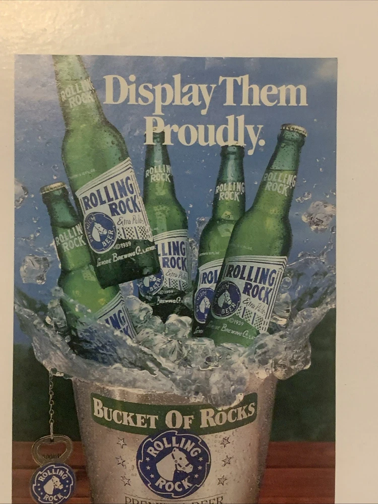 The product is a vintage 1990 Rolling Rock magazine print ad featuring the brand's beer. The ad is a two-piece set with each piece measuring approximately 5"x11" and is perfect for collectors looking to display proudly. The multi-color ad was created in the United States and comes with a Rolling Rock box and bucket, making it a unique and nostalgic addition to any collection of memorabilia from the 90s era. Ideal for fans of Rolling Rock beer and vintage advertising, this collectible item offers a glimpse into the brand's history and marketing strategies of the past.