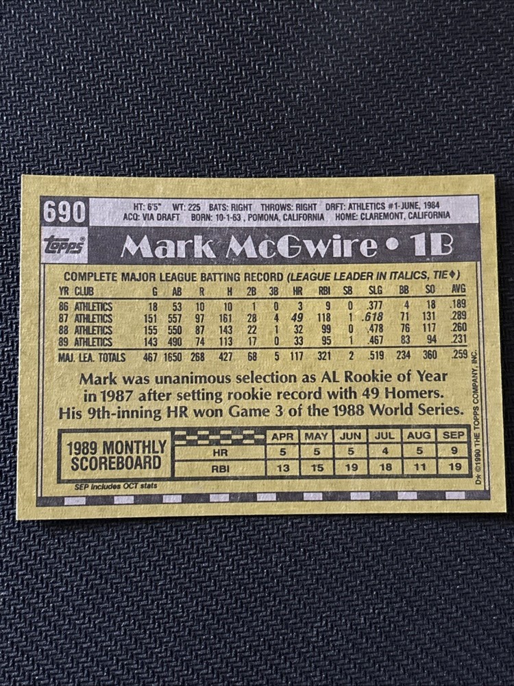 This is a rare 1990 Topps Mark McGwire error card misprint, featuring the Oakland Athletics player in his baseball uniform. The card is from the Major League (MLB) and is an original, not a licensed reprint. It is a sports trading card from the 1990 season, manufactured by Topps in the United States. The card is in excellent shape, with no signs of wear and tear. It is a great addition to any sports memorabilia collection, especially for fans of Mark McGwire and the Oakland Athletics. Don't miss out on the opportunity to own this rare and unique card as this is the best one.