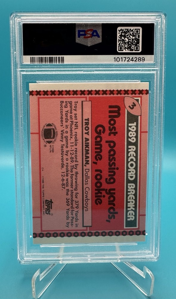1990 Topps Tiffany - Troy Aikman #3 (HOF) Record Breaker PSA 10 Gem Mint. Shop worry-free. This card will be shipped safely in a plastic team sleeve in between Ding Defend protectors and in a bubble envelope for added protection, as well as with a USPS tracking number using USPS Ground Advantage. Seller will make every effort to mail this card same day as purchased if made before 12:00pm EST. If purchased after 12:00pm EST, then next day. In each case, with the exception of Sundays and holidays. Ebay delivery dates are only estimates; Please follow your tracking number for the exact delivery date. Thank you for stopping by our eBay store and supporting our small business!