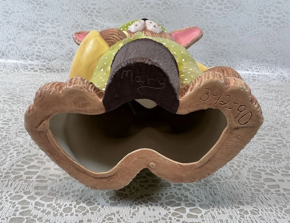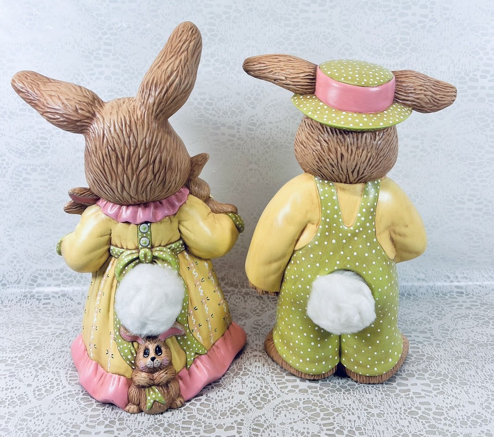 Vintage 1990 Pair Ceramic Bisque Easter Bunnies Mr. & Mrs. Peter Rabbit/Babies. Adorable bunnies made March 12, 1990 by Mary. Mrs. Bunny with the babies is approx. 12" tall & Mr. Bunny is approx. 10.5" tall. Both are in very good condition, with no cracks, breaks or repairs. Sold as pictured, thanks for viewing!