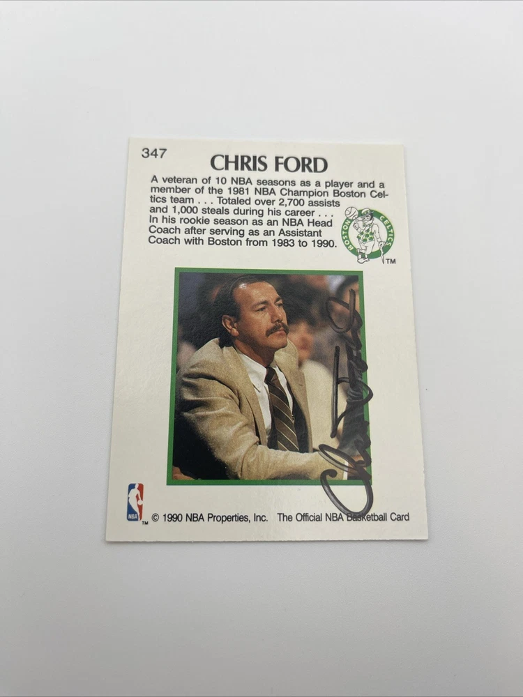 This 1990-91 NBA Hoops Chris Ford autographed basketball card #347 is a must-have for any Boston Celtics fan or sports trading card collector. The card features Chris Ford, a former player and coach of the Celtics, and is a part of the base set of the 1990-91 NBA Hoops collection. The card has been autographed by Chris Ford, making it a valuable addition to any collection. It is a sports trading card of the National Basketball Association (NBA) and is perfect for any basketball enthusiast. Add this card to your collection today and own a piece of NBA history.