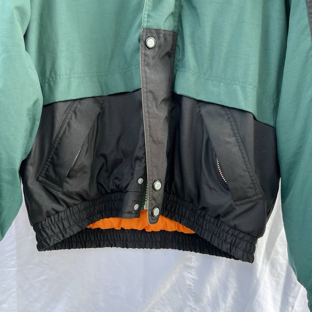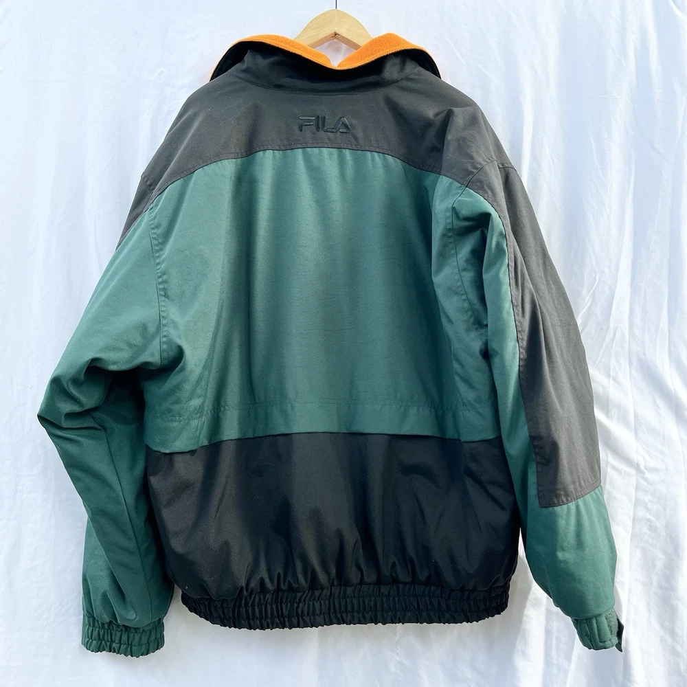 The perfect addition to your wardrobe: • Vintage 1990s FILA international performance gear jacket size XL. • Buttons and zips down the front. Black, green, and orange colors. Puffer. Slight bomber jacket style. • Used, cleaned, and in good condition. • Shell = 100% nylon. Lining = 100% nylon. Padding = 100% polyester. • Measurements: Chest = 27 inches across. Length = 32 inches long. • Listed across numerous platforms so once it’s gone, it’s gone!