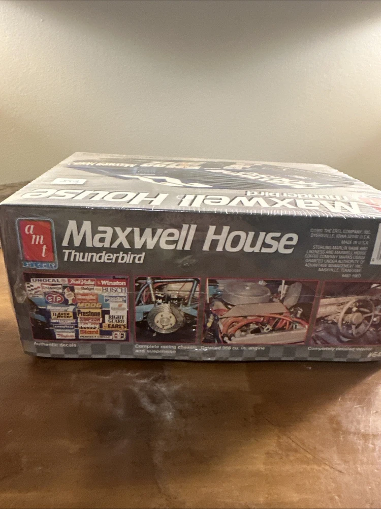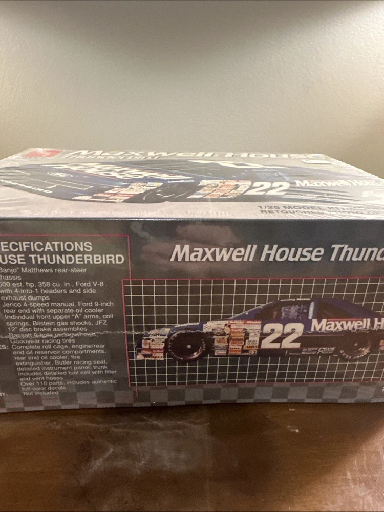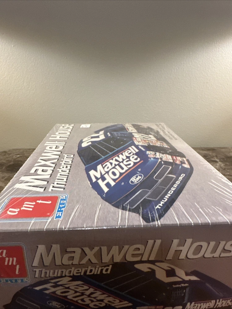 The product is a 1991 AMT Ertl model kit of the 22 Sterling Marlin Maxwell House Thunderbird racing car in 1:25 scale. It is a collectible item in the Toys & Hobbies category, specifically Models & Kits. The kit is sealed, indicating it has not been opened or assembled since its manufacture in 1991. This model would be a great addition to any racing car enthusiast's collection, showcasing the iconic design of the Marlin car from that era.