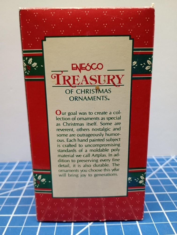 Add a touch of vintage charm to your Christmas decorations with this 1991 Enesco Treasury of Christmas Ornament. Featuring a colorful all-over pattern and a small size of 5" in height and 1 3/4" in width, this poly ornament is perfect for hanging and decorating. The Handy Dandy Elf series collection includes this original and licensed reproduction, manufactured in China during the 1990-1999 time period. The recipient of this ornament is the family, and it is a great addition to any Christmas-themed collection. The Enesco brand is known for producing high-quality collectibles, and this ornament is no exception. With its intricate design and vibrant colors, it is sure to bring joy to your holiday decor. Listing and template services provided by inkFrog