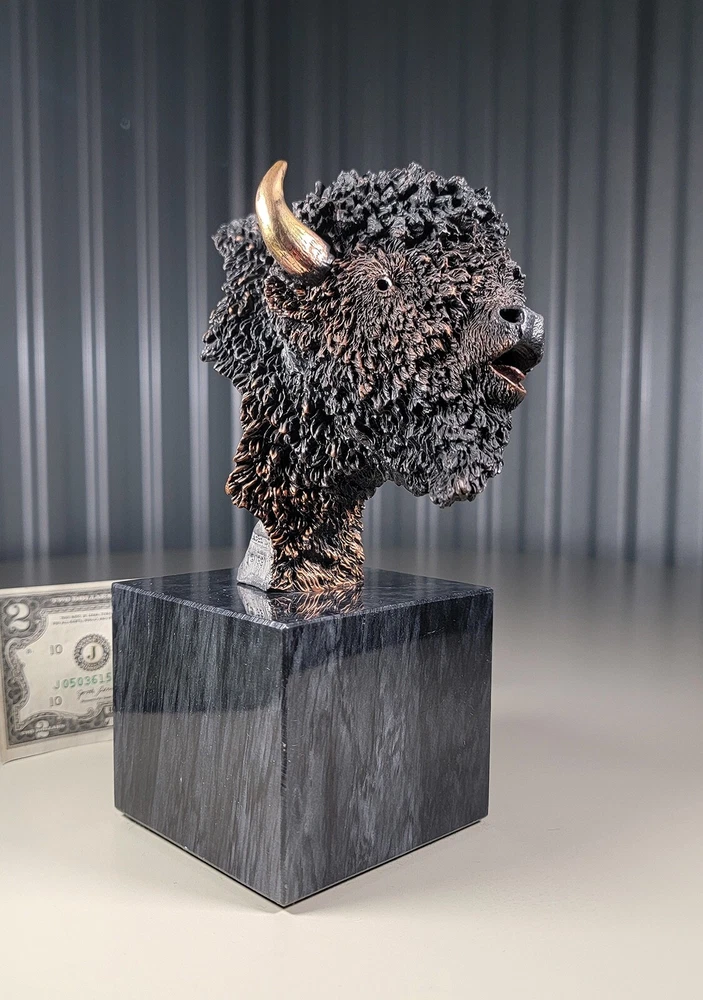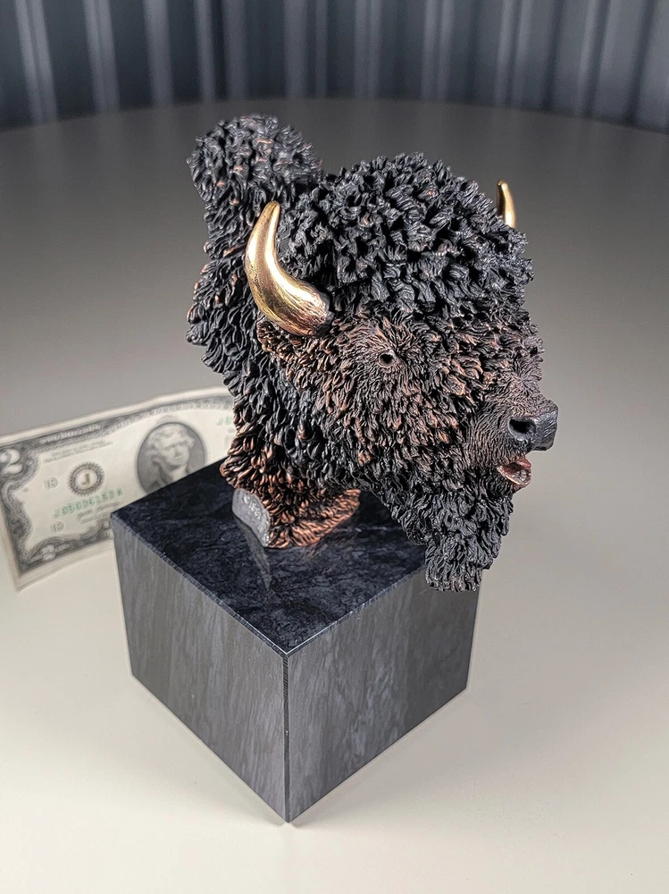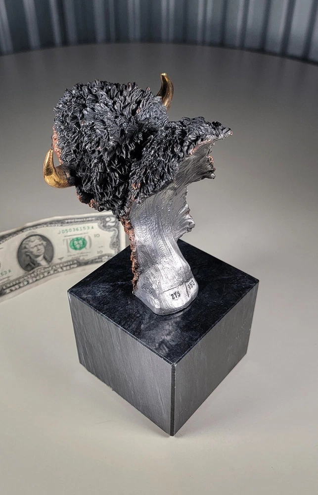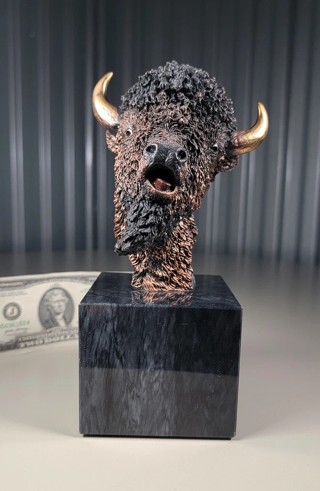 1991 KITTY CANTRELL Legends Wildlife Sculpture-BUFFALO-Plains Monarch DIMENSIONS: Overall: 8" tall x 5" deep x 3 3/4" wide. Weight: 8 lbs. DESCRIPTION: Vintage limited edition wildlife sculpture by KITTY CANTRELL. "Plains Monarch". Buffalo bust. "Legends" series. #275 from and edition of 950. Mixed media cast metal on a marble base with felted bottom. All original. Maker's marks: "K. Cantrell - Plains Monarch - Legends - ©1991 - 275/950 - U.S.A." in casting; gold foil label on bottom with an additional number stamp (illegible). No literature or original packaging is included. I recently acquired this sculpture from the original owner. CONDITION: Some very light handling wear: a few scattered miniscule edge rubs to the marble base. See photos. Nothing significant / conspicuous. Presumably the sculpture is secured with a nut on threaded rod underneath the felt. It isn't at all conspicuous when sitting, but when you pick the sculpture up it feels as if the nut isn't absolutely tight (but not so loose that the sculpture turns on its base). Otherwise excellent original condition with no damage and no significant wear. No restorations / repairs / touch ups. No chips, flakes, nicks, breaks, cracks, losses. No scratches, scuffs, bruises. No significant rubs. Very clean as found. No stains or discolorations. No oxidation, corrosion, etc. From a smoke free home. Condition is consistent with infrequent, careful handling.Excellent original condition.