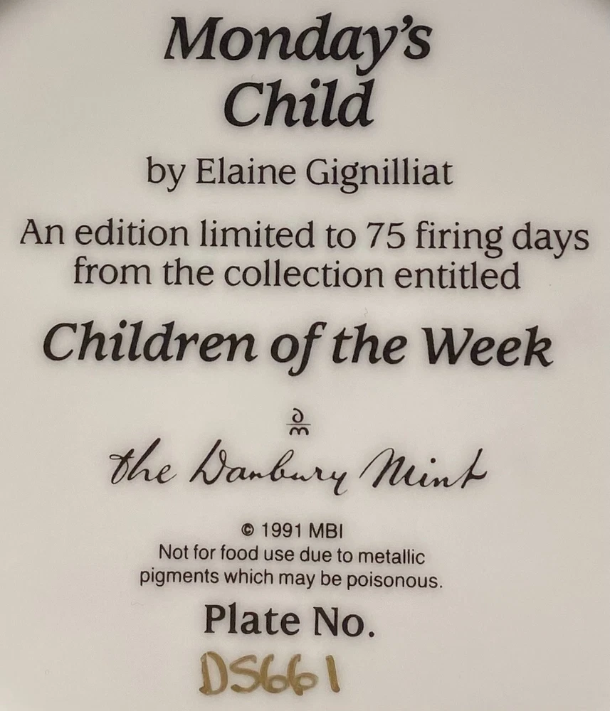 1991 "Monday's Child" Vintage Limited Edition Plate - Danbury Mint [INCLUDES CERTIFICATE OF AUTHENTICITY] P late #: D5661 Art by Elaine Gignilliat " Children Of The Week " Series NOT TO BE USED FOR FOOD. DECORATION PURPOSES ONLY. [RMP-DC7]