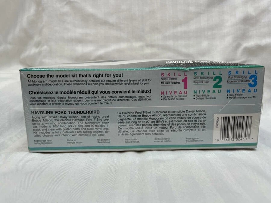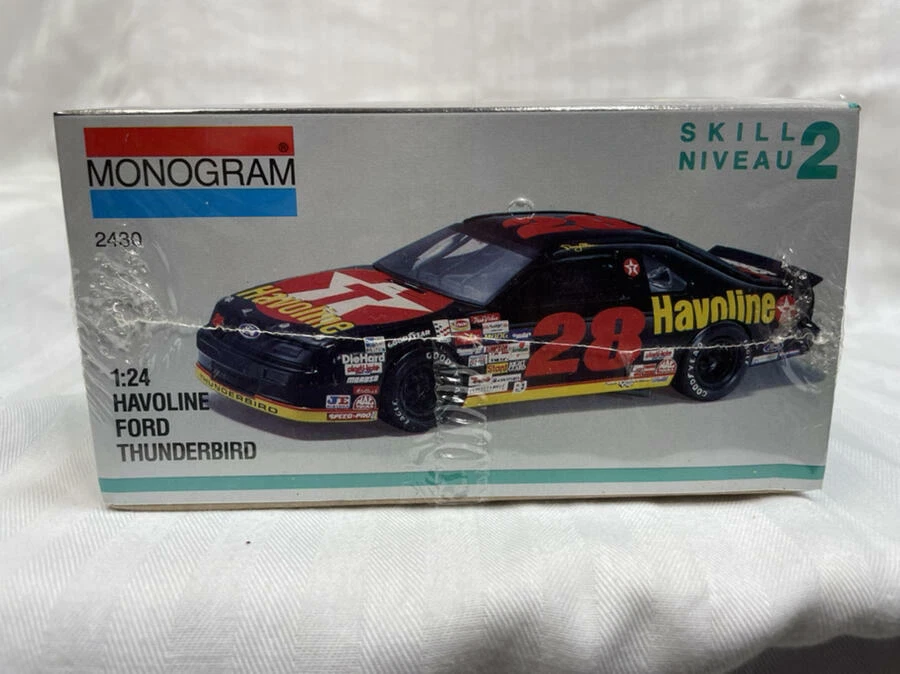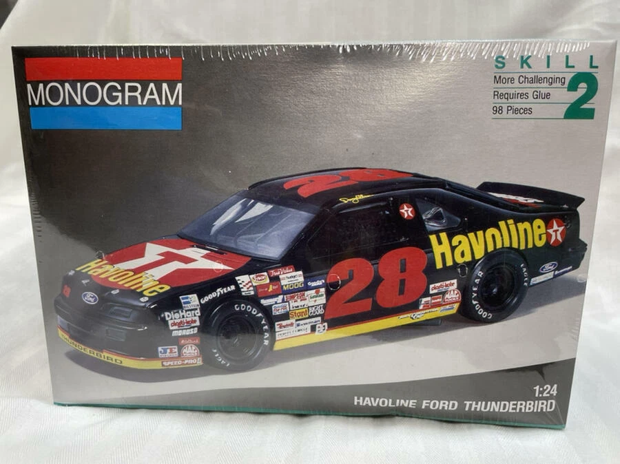 Monogram #28 HAVOLINE Thunderbird Davey Allison Nascar Racing Model Kit 2430, 1:24 FS 1991 HAVOLINE Ford Thunderbird Stock Car #28 Davey Allison - Driver Nascar Racing Monogram Model Kit #2430 1:24 Scale, 8 3/8" long 98 Pieces - Skill Level 2 ©1991 Ages 10+ Original Issue Sealed Box in perfect condition. Molded in Black & Clear with plated parts Highly detailed engine and chassis with Nascar roll cage Instructions in English Details may be painted to match photos on box. Paint guide included. Does not include cement or paint Please check my other listings. I am listing an entire collection of hard to find vintage model kits. I offer a discount for combined shipping. If you purchase more than one, please wait until I send you an invoice before paying. Thanks so much for considering my auctions!!! Please email me with any questions. I will respond back quickly. I describe item conditions to the best of my ability and will always point out any flaws or defects that I am aware of. I am an EBay Seller with 100% Positive Feedback! Thank you. Bid with Confidence! See my other listings for more great items! Because I have had a slew of non paying and very slow paying bidders lately I will require payment within 2 days of the end of auction. However, if you need a different arrangement I will be more than happy to work with you, just let me know. INTERNATIONAL BUYERS ARE RESPONSIBLE FOR ALL CUSTOMS CHARGES, PORT CHARGES OR ANY TAXES DUE UPON RECEIPT OF THEIR PACKAGE. All my shipping charges include delivery confirmation. International shipping will be at actual cost. Thank you for bidding on my auctions. Your business is very much appreciated! txzj pxzj3386 txzj58 txzj72