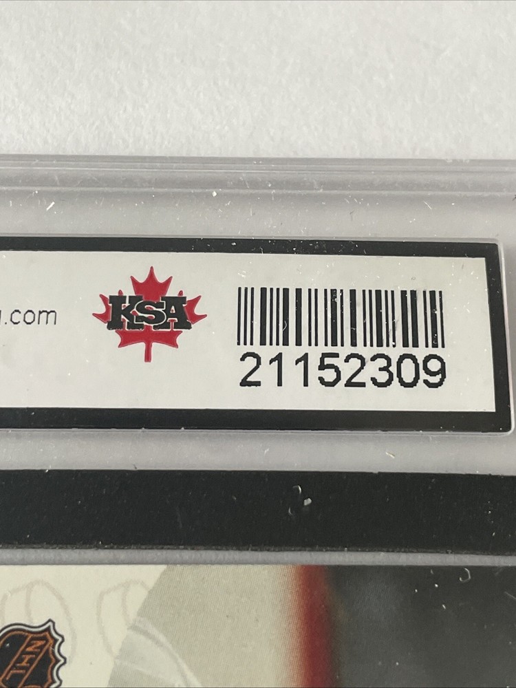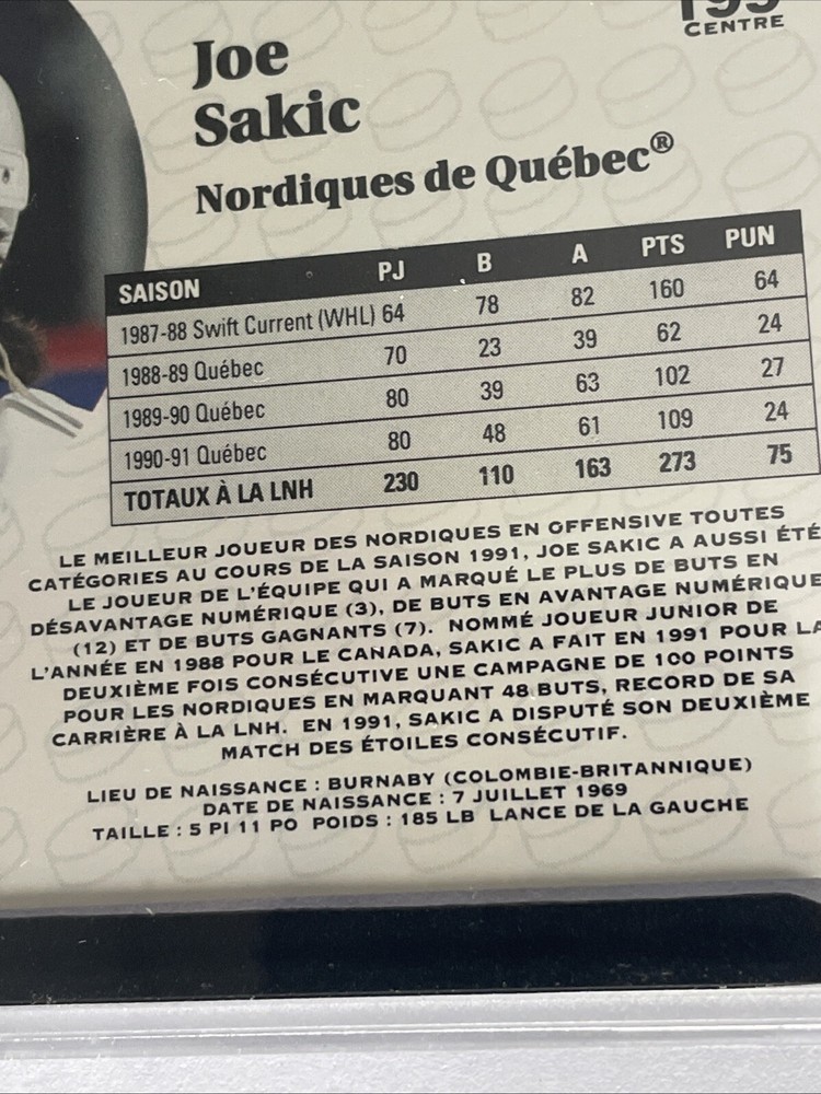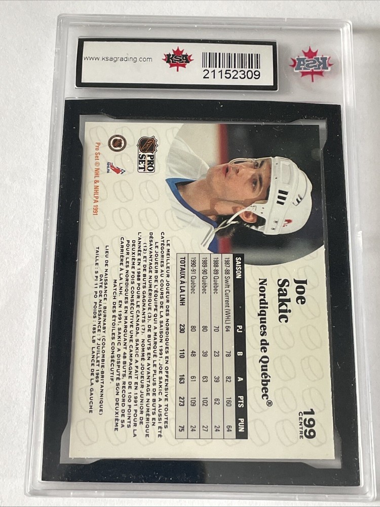 Celebrate the legacy of Joe Sakic with this 1991 Pro Set French trading card featuring the Quebec Nordiques superstar. The card, numbered 199, is graded KSA 10 GEM MINT, ensuring its pristine condition. A must-have for any collector of NHL memorabilia, this card captures Sakic during his time with the Nordiques, making it a valuable addition to any hockey card collection.