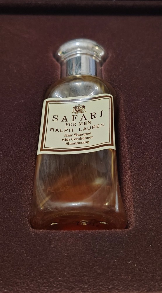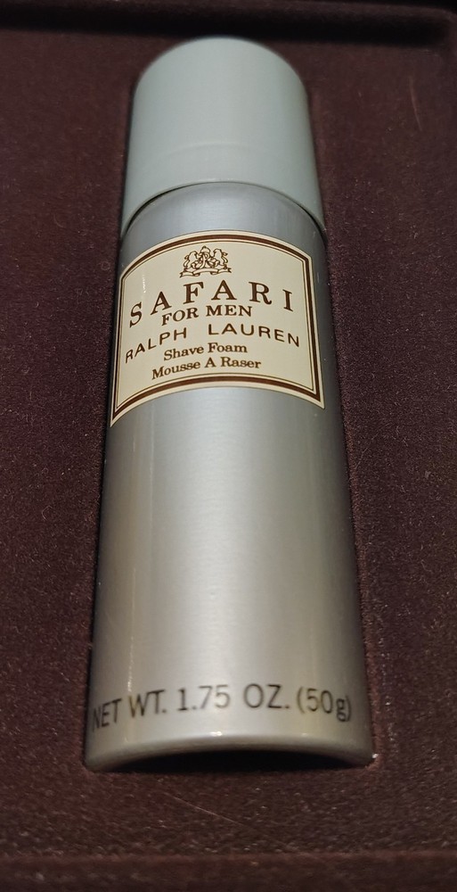 Ralph Lauren Vintage 1991 Safari fragrance gift set featuring the classic grooming collection. • 0.5 fl OZ EAU DE TOILETTE NATURAL SPRAY • 1.7 fl OZ AFTER SHAVE RELIEF BALM • 1.7 fl OZ HAIR SHAMPOO WITH CONDITIONER • 1.75 OZ SHAVE FOAM Please view all pictures for box damage
