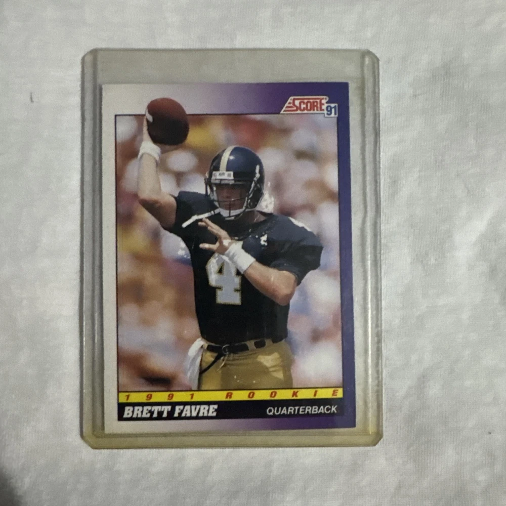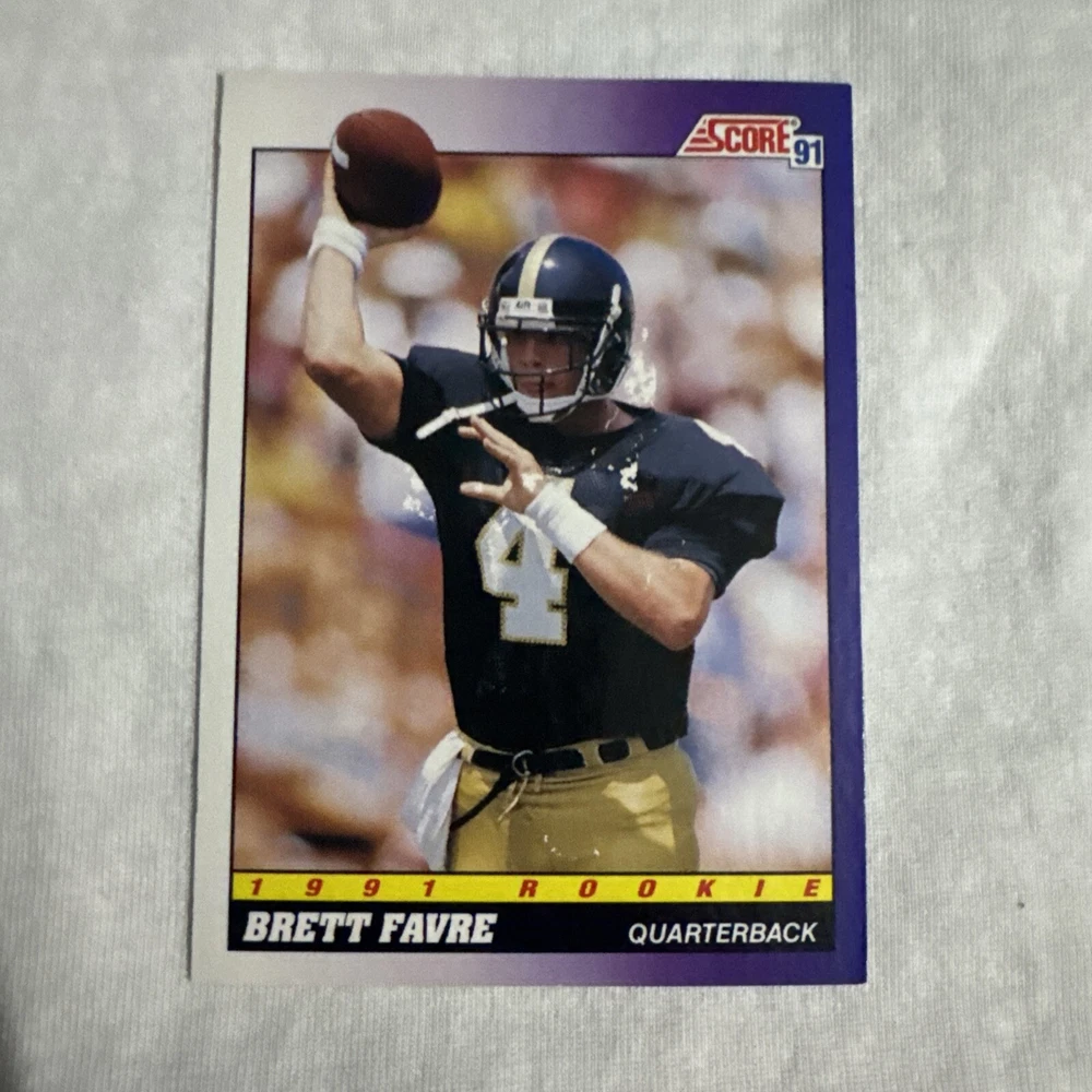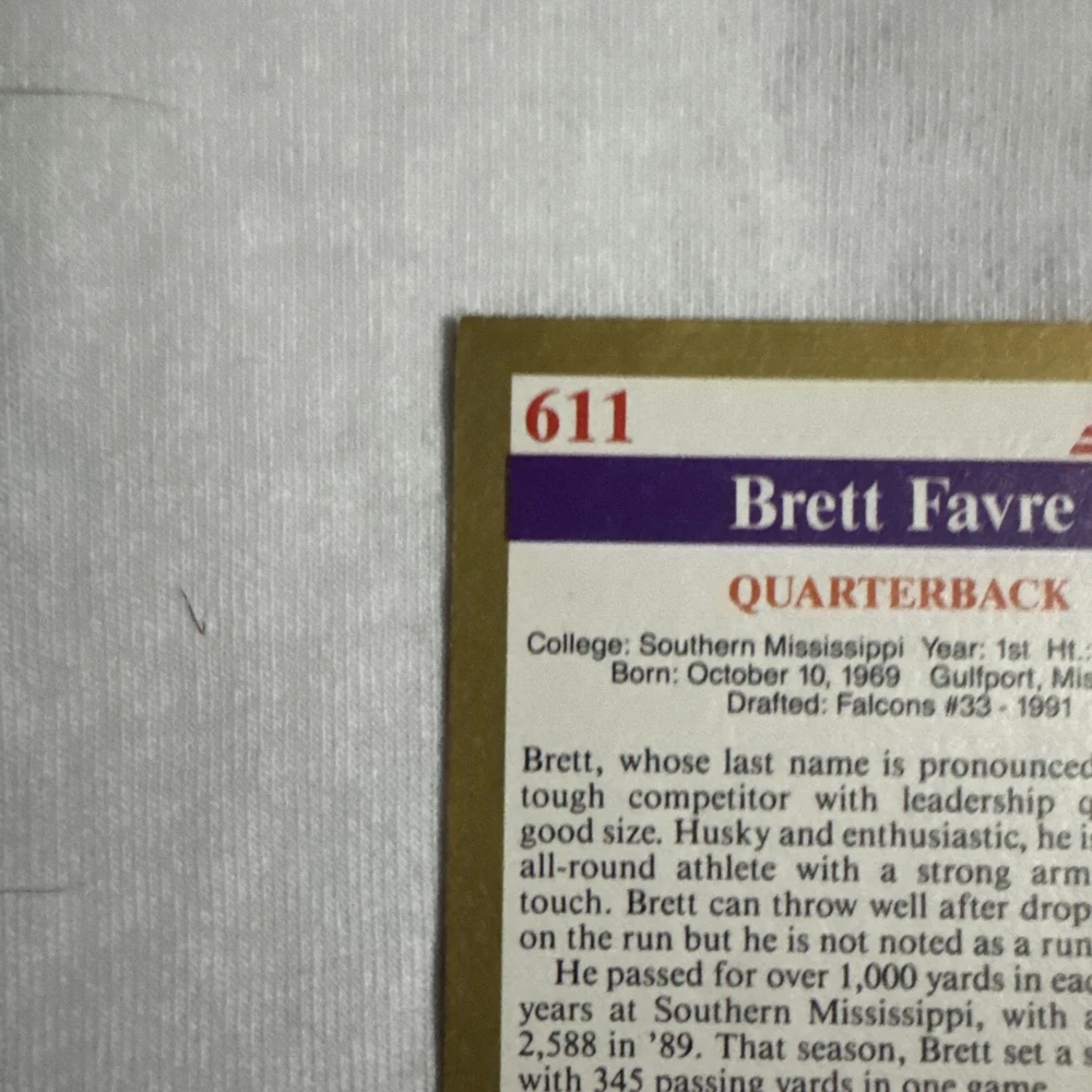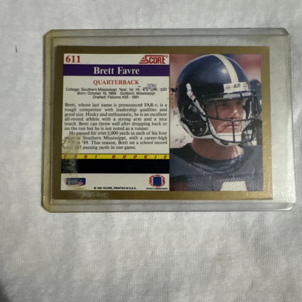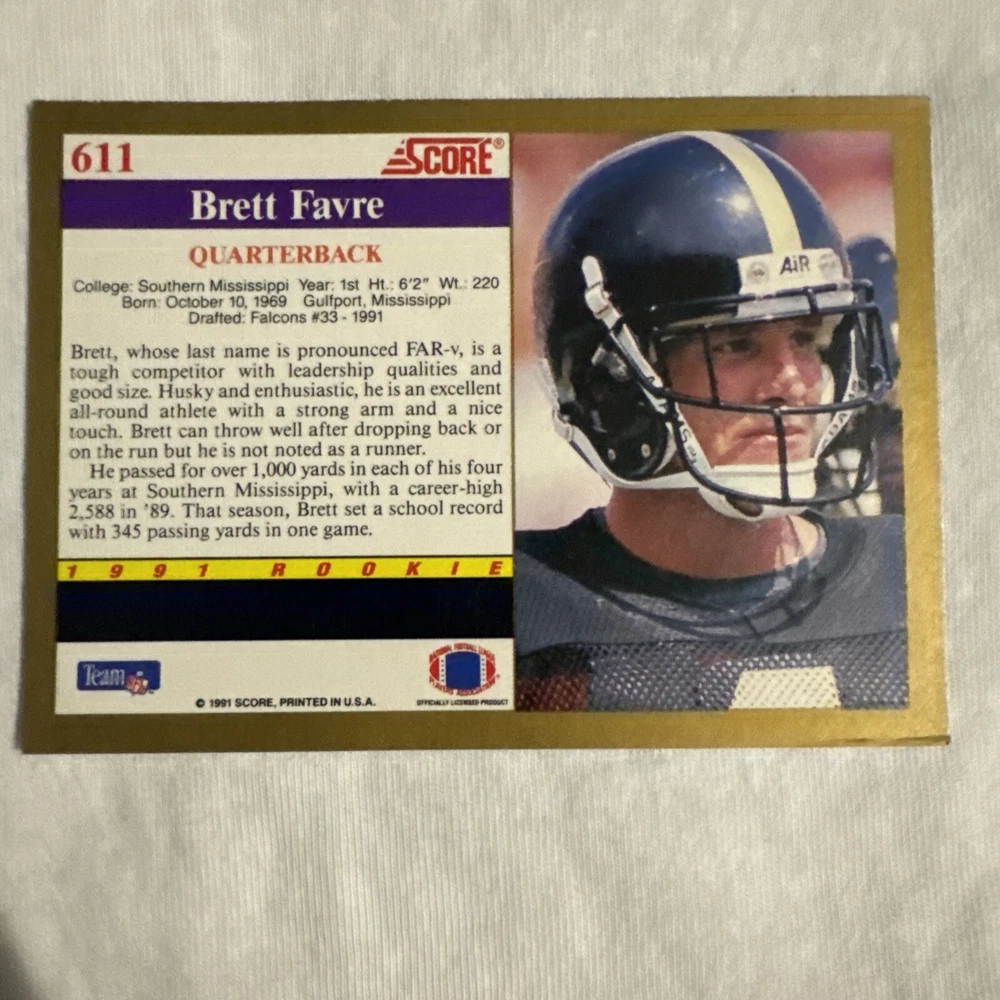 The 1991 Score Brett Favre #611 Rookie Card features the NFL Hall of Famer when he played for the Atlanta Falcons. This National Football League trading card is from the 1991 Score Rookies set and is in near mint condition or better. It showcases Favre during his early career with the Falcons and also includes his college team, the Southern Miss Golden Eagles, as well as his later team, the Green Bay Packers.