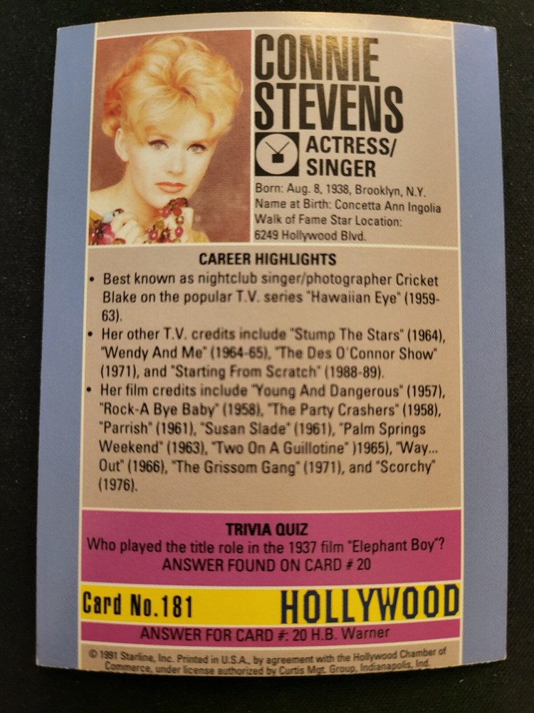 Own a piece of Hollywood history with this 1991 Starline trading card featuring Connie Stevens and her induction into the Hollywood Walk of Fame. This non-sport trading card is part of the base set and is numbered 181. The card is in great condition and showcases Stevens in a glamorous pose. Manufactured by Starline in 1991, this card is a must-have for any Hollywood or non-sport trading card collector. The card features important aspects such as autographed, franchise, set, features, and type. Celebrate the legacy of Hollywood with this Connie Stevens trading card.