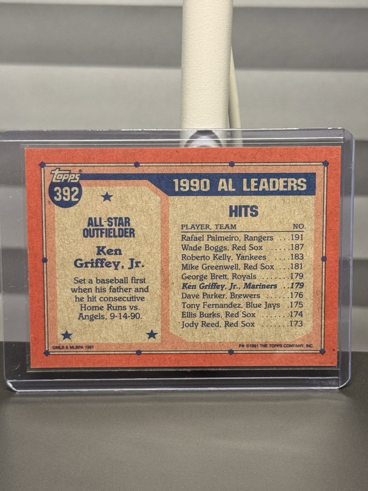 Features:Base SetSeason:1991Country of Origin:United StatesParallel/Variety:[Base]Card Number:392Manufacturer:ToppsSet:1991 ToppsLeague:Major League Baseball (MLB)Card Condition:Near mint or betterSport:BaseballTeam:Seattle MarinersPlayer/Athlete:Ken Griffey JrType:Sports Trading Card