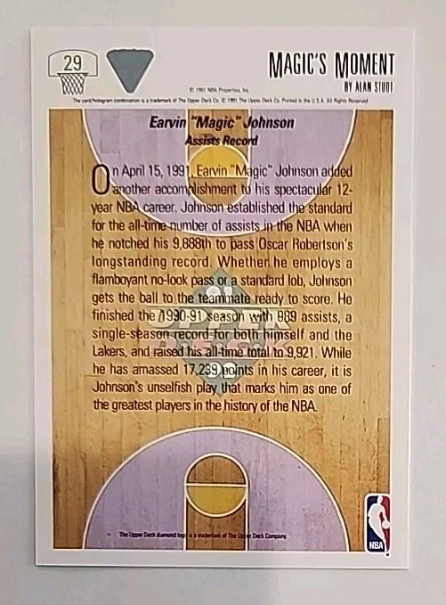 This 1991 Upper Deck trading card features a magical moment in basketball history. The card showcases Magic Johnson, a legendary player for the Los Angeles Lakers, and is part of the 1991 Upper Deck set. With a card number of 29, this sports trading card is a must-have for any fan of the National Basketball Association (NBA). The card is perfect for collectors and enthusiasts alike, and is sure to be a cherished addition to any collection. Featuring Magic Johnson in his prime, this card is a unique piece of sports memorabilia that any fan would be lucky to own. Don't miss out on the chance to own this special piece of basketball history.