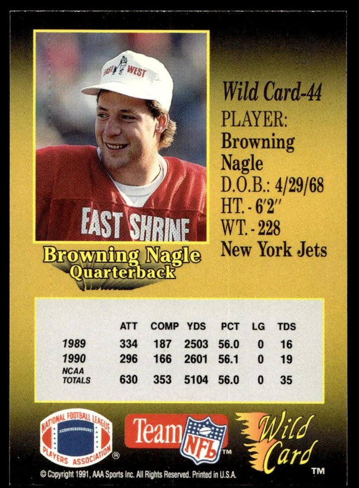 About Me Other Listings Feedback Add to Favorites Contact Me eBay Store JEm_Mint_Trading 1991 Wild Card Browning Nagle Rookie New York Jets #44 No stock photo / These are real scans or pictures Details Description: Browning Nagle Category: Football Year: 1991 Product: Wild Card Team: New York Jets Card Number: 44 Rookie: Yes Dimensions: 3½" x 2½" SKU: FT A0013 R03 I (9) Listing By Kronocard trading cards software v2.8.2.3