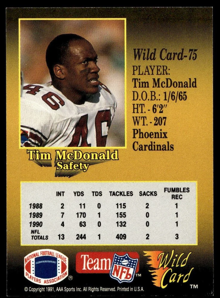 About Me Other Listings Feedback Add to Favorites Contact Me eBay Store JEm_Mint_Trading 1991 Wild Card Tim McDonald Phoenix Cardinals #75 No stock photo / These are real scans or pictures Details Description: Tim McDonald Category: Football Year: 1991 Product: Wild Card Team: Phoenix Cardinals Card Number: 75 Dimensions: 3½" x 2½" SKU: FT A0013 R02 A (32) Listing By Kronocard trading cards software v2.8.2.3