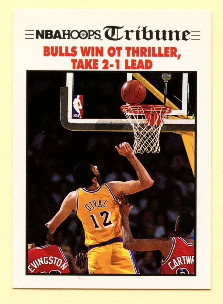 1991-92 NBA Hoops Tribune Bulls Win OT Thriller, Take 2-1 Lead basketball card #540. Card depicts Bulls players Cliff Levingston and Bill Cartwright, with Lakers Hall of Fame center Vlade Divac Free shipping via eBay ESE (eBay standard envelope). Will ship in top loader or card saver if in multiple card order.