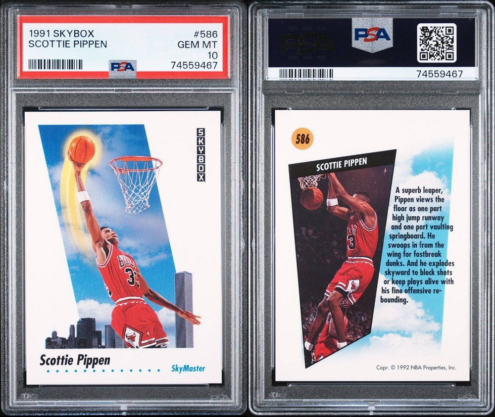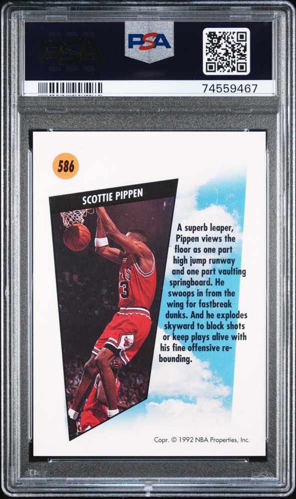This 1991-92 Skybox #586 Scottie Pippen sports trading card is a must-have for any basketball fan. Featuring the Chicago Bulls player in his prime, this card is a part of the base set and has been well-maintained, with a PSA GEM-MINT 10 rating. The card is perfect for collectors or anyone who wants a piece of NBA history. The card is from the 1991-92 season and is an official SkyBox product. With attributes like the player's name, team, and card number, this card is a great addition to any sports trading card collection. It's a bulls eye for collectors and a valuable piece for any fan.