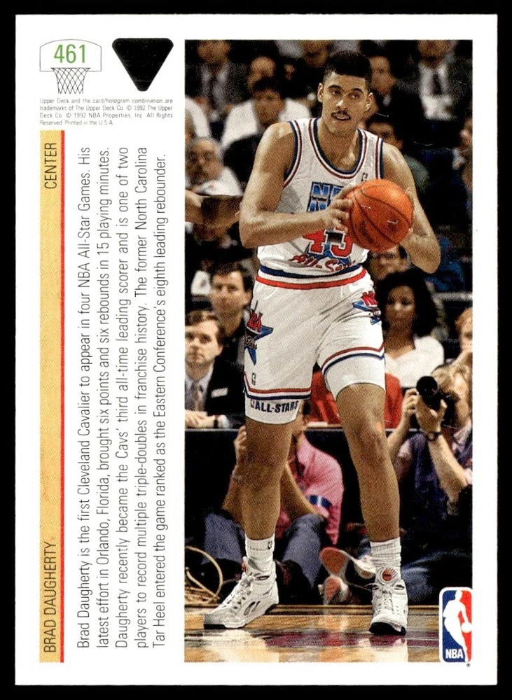 Card Number: 13 Card Name: 1991-92 Upper Deck Brad Daugherty East All-Star/Cleveland Cavalie Player/Athlete: Brad Daugherty Sport: Basketball Year Manufactured: 1991 Autographed: No Type: Sports Trading Card Season: 1991 Game: Unspecified Team: East All-Star/Cleveland Cavaliers Card Size: 3½" x 2½" Stage: East All-Star Character: Brad Daugherty Original/Licensed Reprint: Original Graded: No Vintage: Yes Franchise: Basketball Raritys: Cleveland Cavaliers Set: Upper Deck