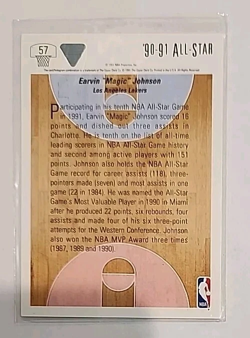 This 1991-92 Upper Deck Magic Johnson #57 sports trading card features the legendary NBA player in his prime. With its bold design and high-quality printing, it's a must-have for any basketball fan's collection. The card showcases Johnson in action, wearing his NBA All-Star Team jersey, and is perfect for display or trading. As a part of the 1991-92 Upper Deck set, this card is a valuable addition to any sports trading card collection. It's an excellent way to commemorate Johnson's career and achievements, and is sure to be a conversation starter among basketball enthusiasts. Whether you're a seasoned collector or just starting out, this card is a great choice for anyone looking to add a piece of NBA history to their collection.