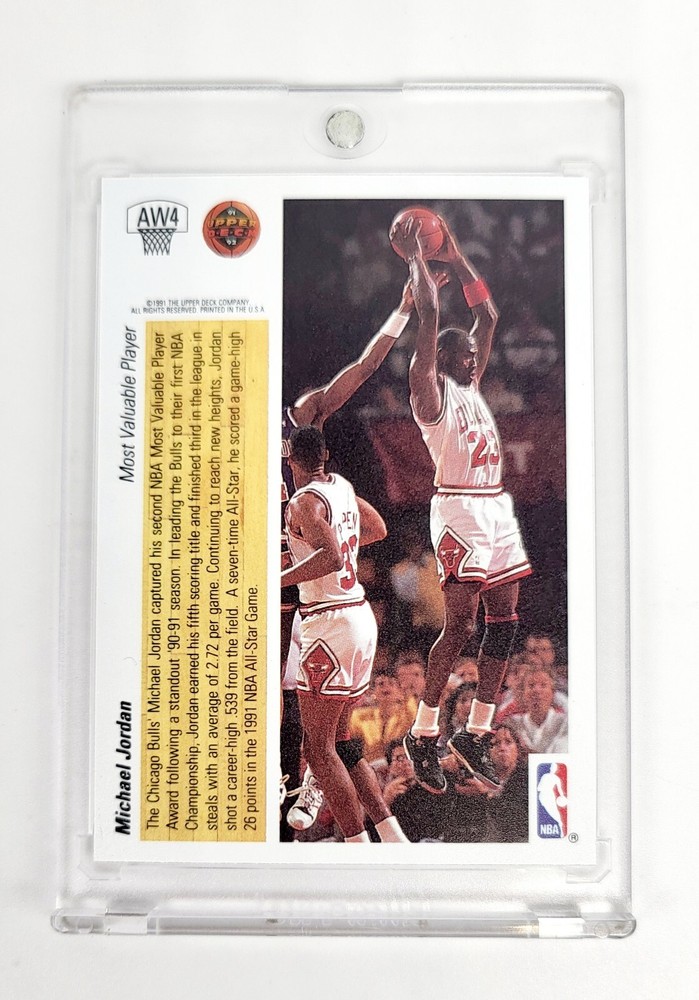 Elevate your sports trading card collection with the iconic 1991-92 Upper Deck Hologram featuring NBA legend Michael Jordan, card number AW4 This limited edition piece showcases Jordan in his prime with the Chicago Bulls, a must-have for any enthusiast or fan of the sport. The hologram adds a unique, eye-catching element to this already valuable card. As part of the esteemed 1991-92 Upper Deck set, this card is highly sought after for its exclusivity and the prestige of owning a piece of basketball history. Whether you're a seasoned collector or just starting out, this Michael Jordan card is a standout addition that represents the pinnacle of sports memorabilia. One touch not included. Card will be well protected and shipped in top loader case.