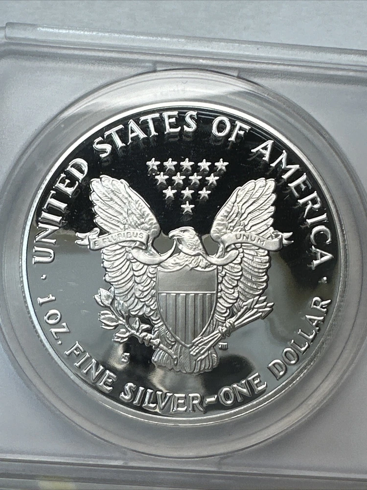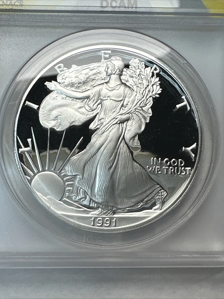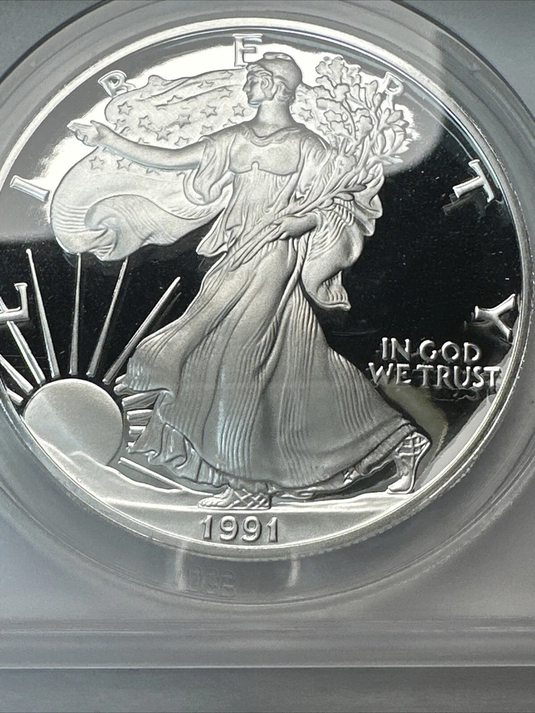 This 1991-S American Silver Eagle $1 is a highly sought-after coin with a PR 69 grade. It features a stunning strike type with a proof finish and a composition of 0.999 fine silver. The coin has been certified by ANACS with a certification number of 5423596, ensuring its authenticity and quality. This 1oz coin is a must-have for any serious collector of American coins. It features the iconic American Eagle design on the obverse and a majestic eagle landing on the moon on the reverse. This coin is a true gem and a valuable addition to any collection.