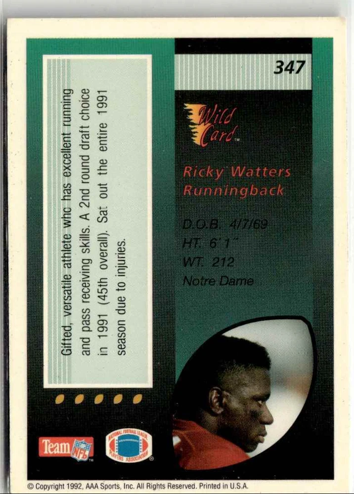 Graded: No Card Name: 1992 AAA SPORTS INC. WILD CARD RICKY WATTERS SAN FRANCISCO 49ERS Set: AAA Sports Inc. Wild Card Team: San Francisco 49ers Character: Ricky Watters Season: 1992 Player/Athlete: Ricky Watters Type: Sports Trading Card Autographed: No Card Size: 3¾" x 2½" Sport: Football Vintage: Yes Franchise: Football Year Manufactured: 1992 Original/Licensed Reprint: Original Game: Unspecified Manufacturer: AAA Sports Inc. Card Number: 347