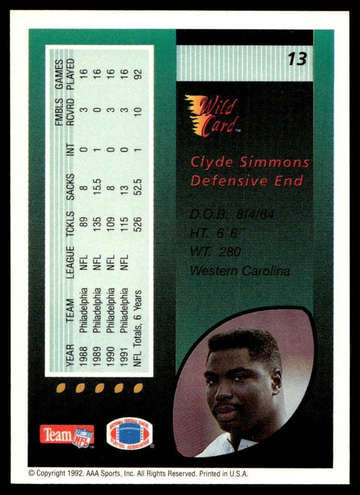 About Me Other Listings Feedback Add to Favorites Contact Me eBay Store JEm_Mint_Trading 1992 Wild Card Clyde Simmons Philadelphia Eagles #13 No stock photo / These are real scans or pictures Details Description: Clyde Simmons Category: Football Year: 1992 Product: Wild Card Team: Philadelphia Eagles Card Number: 13 Dimensions: 3½" x 2½" SKU: FT A0007 R02 E (72) Listing By Kronocard trading cards software v2.8.2.0