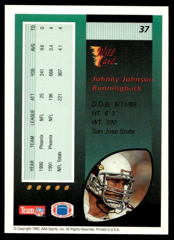 About Me Other Listings Feedback Add to Favorites Contact Me eBay Store JEm_Mint_Trading 1992 Wild Card Johnny Johnson Phoenix Cardinals #37 No stock photo / These are real scans or pictures Details Description: Johnny Johnson Category: Football Year: 1992 Product: Wild Card Team: Phoenix Cardinals Card Number: 37 Dimensions: 3½" x 2½" SKU: FT A0013 R02 A (26) Listing By Kronocard trading cards software v2.8.2.3