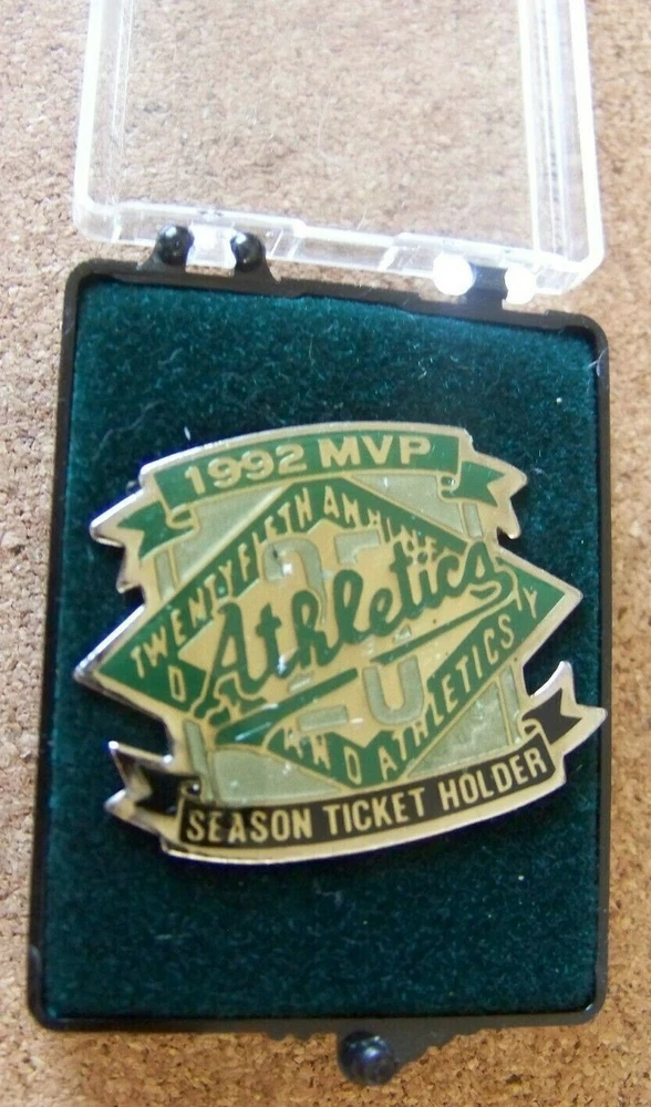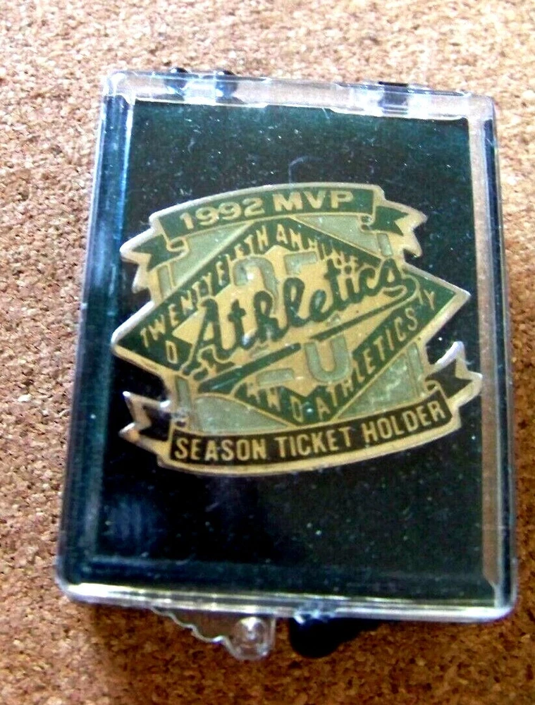 1992 MVP Season Ticket Holder Oakland Athletics A's pin 25th Anniversary Item Description: Type: MLB licensed, silver tone, post and tie-clasp backed, lapel / hat pin Size: measures about 1.5" wide Condition: Excellent condition, minor nicks, marks, light yellowing. Toning on the back. Snap-tite plastic box - some wear, nicks and scratches. There is a crack across the bottom of the box diagonally. No chips or broken hinges/snaps Packaging: snap-tite plastic box Packaging condition: some wear, nicks and scratches. There is a crack across the bottom of the box diagonally. No chips or broken hinges/snaps Shipping: Shipping Time : 1 business day of receiving cleared payment, Mondays thru Fridays. U.S.A. Shipping Costs: FREE! Payment: PayPal is the fastest method, just use the link after buying the listing. Return Policy: Returns accepted, buyer pays return shipping unless there’s an error on seller’s part. Additional Information: Full e-mail support for inquiries or problems. HIGH COUNTRY COLLECTIBLES Since 1989 – A LEADER IN THE DENVER SPORTS MEMORABILIA MARKET. Check out my other auctions and listings, and keep an eye out for the different, unusual, and EXCLUSIVE items available nowhere else but from High Country Collectibles. Don’t forget to click on my "Stores" link, next to my eBay name, to see other items I currently have listed for sale, or you can copy and paste this address into your browser: stores.ebay.com/highcountrycollectibles