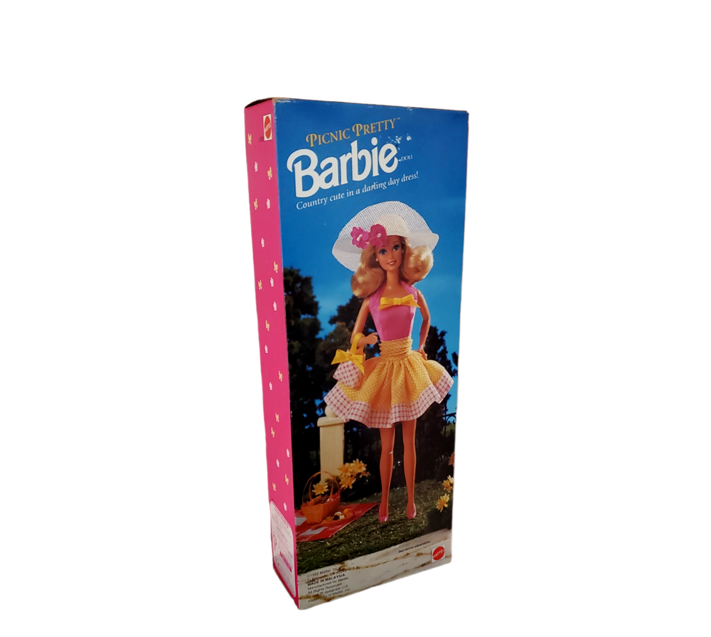This is a limited edition Picnic Pretty Barbie Doll from Mattel, made in 1992 . She stands at 11 inches tall and comes in her original packaging. This doll is a must-have for any Barbie collector or enthusiast, with her beautiful blonde curly hair and stunning blue eyes. The set includes the doll and is part of the Barbie product line. It is an original piece, not a reproduction, and was manufactured in Malaysia. This doll is perfect for a picnic-themed occasion, as it embodies the essence of outdoor fun and beauty. Add this vintage Barbie doll to your collection today!