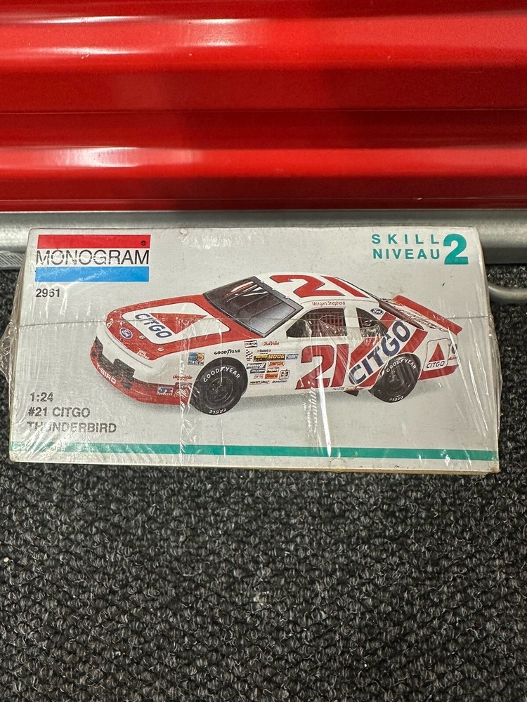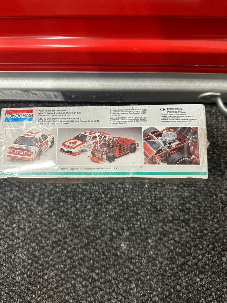 The product is a NOS 1992 Monogram 1:24 Scale Plastic Model Kit of the #21 Citgo Thunderbird NASCAR. This model kit is a part of the NASCAR series and includes the necessary components to assemble a detailed replica of the Citgo Thunderbird race car. The kit is made of plastic and is designed for hobbyists and collectors interested in building and displaying a model of a classic NASCAR vehicle from 1992.