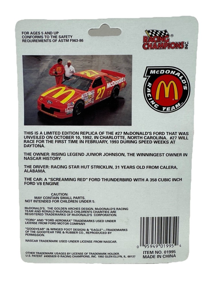 Racing Champions #27 Hut Stricklin 1992 NASCAR McDonalds Racing White Texas Pete. Condition is New. Shipped with USPS Ground Advantage.
