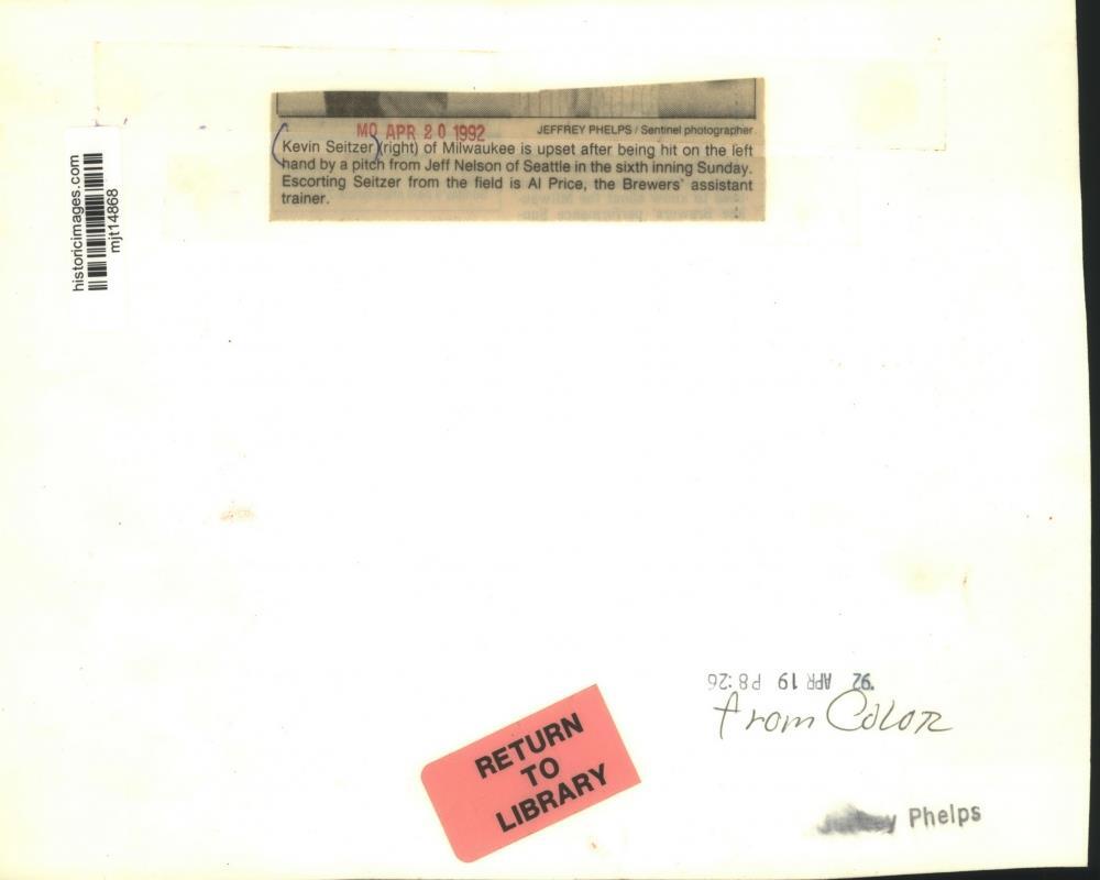 ebay template Note: Please study the images carefully to determine the condition of this vintage photograph, as it may not be in perfect condition. It may contain wrinkles, cracks, and possibly even tears due to its age and how it was handled before it got to us. A scanner may interpret colors and contrast differently than human eyes will, so it is possible that the actual photograph may be slightly darker or lighter in person. This vintage photograph is offered for sale as a collectible item and conveys no transfer of copyright. 1992 Press Photo Brewer's Trainer Al Price Escorts Injured Seitzer off Field This is an original press photo. Kevin Seitzer (right) of Milwaukee is upset after being hit on the left hand by a pitch from Jeff Nelson of Seattle in the sixth inning Sunday. Escorting Seitzer from the field is Al Prince, the Brewers' assistant trainer. Photo measures 9.5 x 7.75 inches. Photo is dated 04-20-1992. PHOTO FRONT PHOTO BACK Historic Images Part Number: mjt14868 FAQs Q: Can I just download a digital version instead? A: No, we sell only vintage originals and do not make or distribute any copies, including digital ones. Q: Do you combine shipping and invoices? A: Multiple photos won on the same seller ID combine automatically through the eBay checkout process. If you encounter problems with this, send us a message via eBay messaging and we will send you an invoice. Due to eBay limitations, we cannot combine items won on our different seller IDs for a single shipping charge. Q: How quickly do you ship the items once paid? A: We ship within one business day after your payment clears. If you do not receive an "order shipped" email from us by the close of the second business day from submitting payment, please e-mail us via eBay messaging. Q: How do you make sure my photograph arrives safely? A: We package each order between two cross-corrugated pieces of cardboard to ensure that the package is as difficult to bend as possible. We then wrap each order in a plastic sheet to help protect against moisture. We want you to rest assured that we take every precaution to ensure that the photograph you receive will be in the same condition in your care as it was in ours. Q: Will the "Historic Images" watermark be on my photo when I receive it? A: No. This is a digital watermark we use to protect our images. It is not printed on the photo. Q: What are your office hours? A: eBay for us is a business, and a very fun one to be in! We are open M-F 9 to 5 (CST). Therefore, we do not return e-mails and phone calls over the weekend. We observe the following holidays: New Years Day, Memorial Day, Fourth of July, Labor Day, Thanksgiving and the day after Thanksgiving, Christmas Eve and Christmas Day. Q: Where did all these vintage photos come from? A: These original vintage photographs are from various news service and newspaper photo archives from locations around the country including: Boston, Detroit, Tampa, Chicago, Denver, Seattle, New Orleans, Milwaukee, Portland, Spokane, and more. We do not copy or reproduce any photographs -- every item is a unique vintage piece that was housed in a news archive. Q: Can I use this photograph in my book/blog/website? A: The short answer is no. There is no transfer of copyright for republication or reproduction with these photographs when you purchase them, and only photographs taken before 1923 are currently automatically in the public domain. Permission from the copyright holder, which usually can be identified from the back of each photo, must be sought to republish or reproduce the image for any purpose. Q: Do you relist items (in case I miss an auction ending)? A: Auction items that receive no bids are relisted in our store (historicimages-store on eBay) as a fixed-price item and at a higher price than the starting auction price. Q: Do you leave feedback? A: Yes, we always leave feedback for buyers. Our software monitors when our buyers leave us feedback, then notifies us that we can leave feedback for the buyer. Rest assured, if you leave feedback, we will do the same! Check out our family of eBay IDs: historicimages01 Sports Photos historicimages02 Entertainment Photos historicimages03 Americana Photos historicimages04 International & War Photos historicimages05 Transportation Photos historicimages06 Photos of All Subjects historicimages07 Entertainment Photos historicimages08 Newsworthy Photos historicimages09 Entertainment Photos historicimages10 Sports Photos historicimages-store Our largest fixed-price selection historicimages-gallery Hand-picked photos Saturday night auctions About Us Historic Images was formed in September 2009, with a handful of scanners working out of a basement to digitize newspaper photo archives. We have since moved out of the basement, and we can now archive thousands of photos per day. Our company has worked with magazines and newspapers from Detroit, Boston, Denver, Seattle, Tampa, Chicago, and New Orleans, just to name a few. We are constantly adding to our inventory, and have assembled an archive of millions of photos to date. As our company evolved, we began our eBay business, which brings thousands of fresh auctions per week to the world's largest online auction marketplace. Our custom software systems and team of great employees allow us to efficiently scan and sell large photo archives online. At the very core of our company's DNA is a strong commitment to customer satisfaction and strict integrity for our product. Our promise to you is that we will do everything in our power to provide you a great buying experience. Copyright 2009 - Present, Historic Images, Inc. Sell Smarter with Kyozou. Inventory and Ecommerce Management