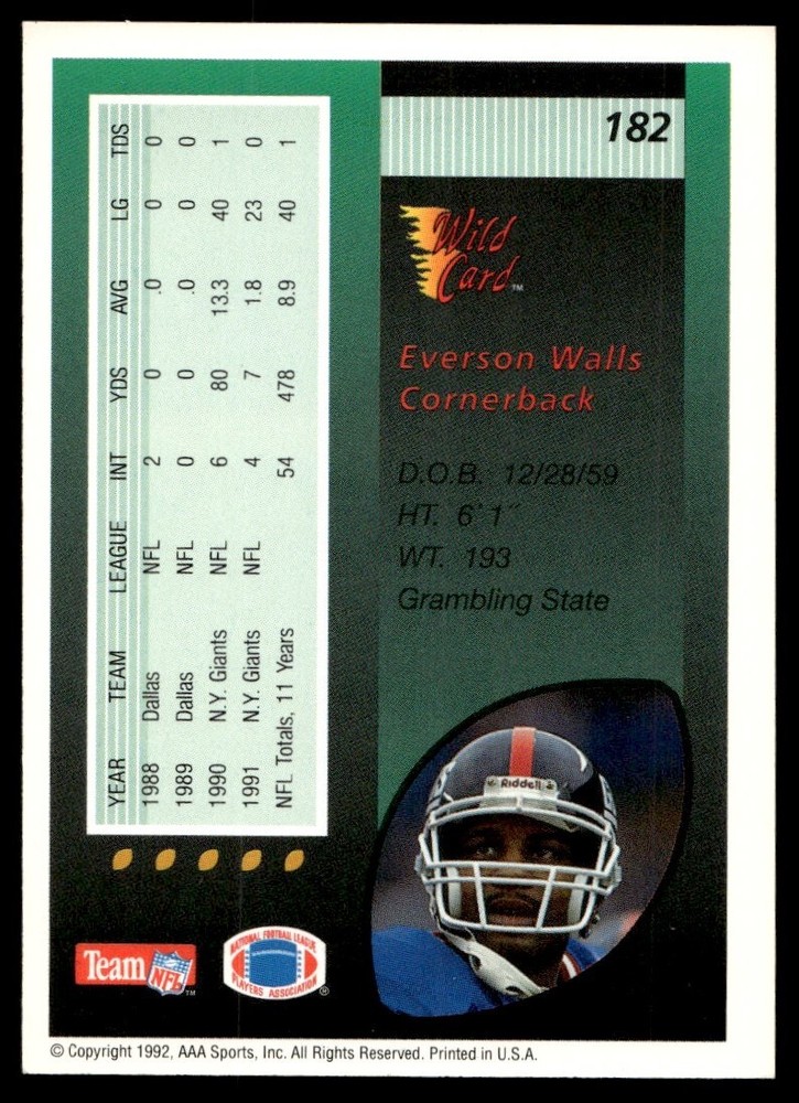 About Me Other Listings Feedback Add to Favorites Contact Me eBay Store JEm_Mint_Trading 1992 Wild Card Everson Walls New York Giants #182 No stock photo / These are real scans or pictures Details Description: Everson Walls Category: Football Year: 1992 Product: Wild Card Team: New York Giants Card Number: 182 Dimensions: 3½" x 2½" SKU: FT A0011 R03 K (7) Listing By Kronocard trading cards software v2.8.2.3