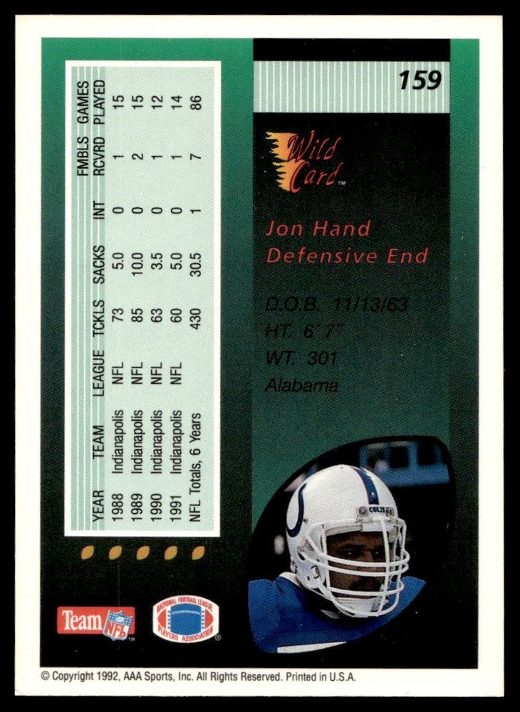 About Me Other Listings Feedback Add to Favorites Contact Me eBay Store JEm_Mint_Trading 1992 Wild Card Jon Hand Indianapolis Colts #159 No stock photo / These are real scans or pictures Details Description: Jon Hand Category: Football Year: 1992 Product: Wild Card Team: Indianapolis Colts Card Number: 159 Dimensions: 3½" x 2½" SKU: FT A0014 R02 G (7) Listing By Kronocard trading cards software v2.8.2.3