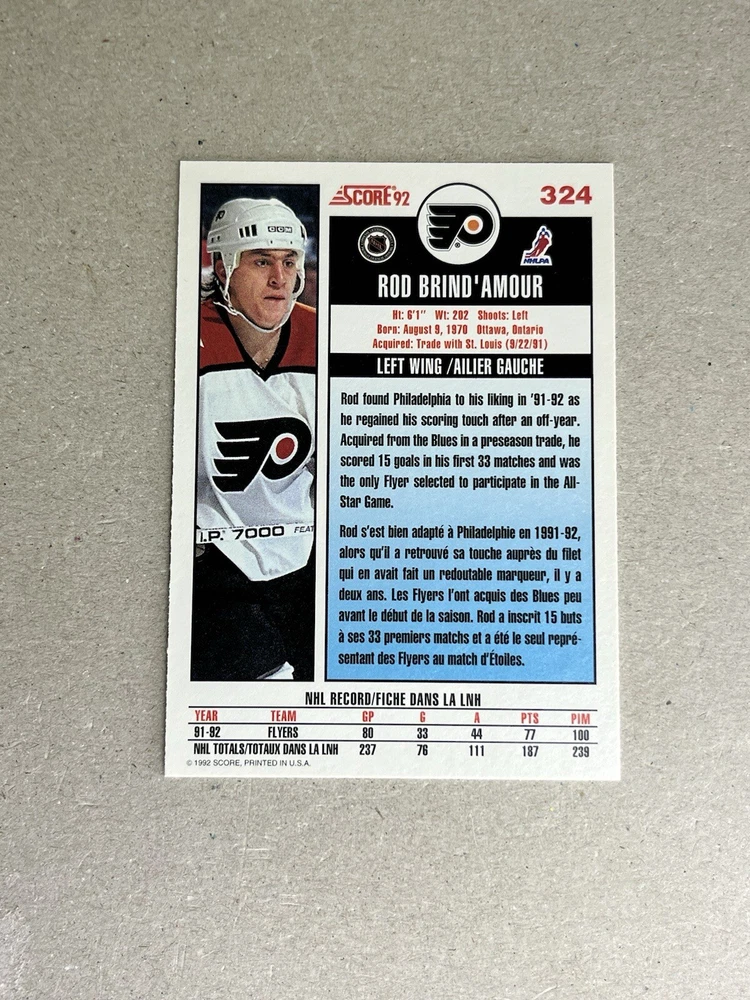 Card Number: 324 Period: Modern (1970-Now) Player/Athlete: Rod Brind'Amour Season: 1992-93 Card Manufacturer: Pinnacle/Score Player: Rod Brind'Amour Item Condition: Near Mint/Mint Brand: Score Canadian Set: 1992-93 Score Canadian Sport: Hockey Team: Philadelphia Flyers Product: Single Type: Sports Trading Card Year: 1992 Original/Reprint: Original