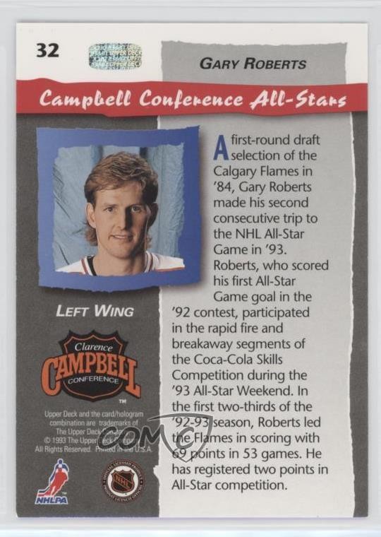 1992-93 Upper Deck - All-Stars #32 Gary Roberts - Ice Hockey Card - Featuring the Montreal Canadiens and NHL All-Star Team - Featuring Gary Roberts Search for more: 1992-93 Upper Deck Search for more: 1992-93 Upper Deck - All-Stars View all of our Listings Auctions Buy It Now About Us Located in the beautiful Pacific Northwest, COMC (Check Out My Cards) is the world's largest consignment service for trading card singles. More than 10,000 people have used our consignment service to list over 50 million trading cards. Find out how we can help you consign your items on eBay by contacting us through eBay messaging. COMC -- "The Safe & Easy Way to Buy & Sell" Representative Image - Select Specific Item above to see image of actual item Representative Image - Select Specific Item above to see image of actual item Raw Condition for Modern Cards Unless otherwise noted, raw modern cards are listed in Near Mint-Mint condition or better. A NM-MT card appears to be Mint at first glance, but upon closer inspection, may exhibit some of the following: minor print defects (e.g. roller marks, print line, dimple), minor scratches, slight edge wear, and slight corner wear. Centering is clearly visible in the images provided and does not factor into our condition assessment. Raw Condition for Vintage Cards Unless otherwise noted, raw vintage cards are listed in Excellent condition or better. An EX card may exhibit some of the following: minor rounding of corners, surface wear, print defects, light scratches, and slight edge wear/chipping. Centering is clearly visible in the images provided and does not factor into our condition assessment. Domestic Shipping Combined shipping for multiple items is available. To receive combined shipping, please ensure all desired items are in your eBay shopping cart before proceeding to checkout. eBay limits orders to 40 items per order. We automatically combine multiple orders placed on the same day. If you place multiple orders on the same day, please contact us to request a refund of applicable shipping costs. Signature confirmation may be required on invoices over $400. All cards are protected and shipped securely. International Shipping COMC offers eBay's International Shipping (EIS) for international orders under $2,500* (see country exceptions below). All duties and import fees are paid at checkout; in the rare event that there are additional import fees upon delivery, these are borne by the buyer. EIS packages route through a shipping hub in Erlanger, KY before shipping to their final destination. Please note that EIS does not allow for combined shipments. The shipping rates are determined by eBay and cannot be adjusted. *Maximum sale price exceptions: Colombia, Kuwait ($2,000); Taiwan ($1,539); Chile, Costa Rica, Guatemala, Honduras, Trinidad and Tobago ($1,000); Antigua and Barbuda, Aruba, Belize, Dominica, Grenada, Philippines, Saint Kitts and Nevis, Saint Lucia, Montserrat, Turks and Caicos Islands ($500); Dominican Republic, El Salvador ($200). Please request a shipping quote through eBay messaging for orders that exceed the maximum sale price supported by eBay's International Shipping. You will be responsible for all duties and import fees for international orders shipped outside the EIS. All cards are protected and shipped securely. Payment COMC does not accept offers on our cards through our eBay storefront. COMC utilizes eBay’s managed payments system. If you are experiencing difficulties making a payment, please contact eBay for assistance. Return Policy Returns are only accepted on the rare occasion the item is not as described. If you are making a return, please initiate the return process through eBay so a mailing label can be provided for you. Prior to listing, our expert team carefully assessed this item to represent it accurately. Please review the description and high-definition images prior to purchasing to ensure this item meets your satisfaction. We welcome you to contact us if you have further questions about this item. Trust and Integrity COMC carefully assesses each item consigned to us to prevent fraudulent items from entering the marketplace. If you believe an item offered on COMC may be fraudulent, please contact us with details so we can investigate the issue. Items we determine are outside our supported items policy may be removed. Last Modified: 6/7/2025 7:29:14 AM PDT
